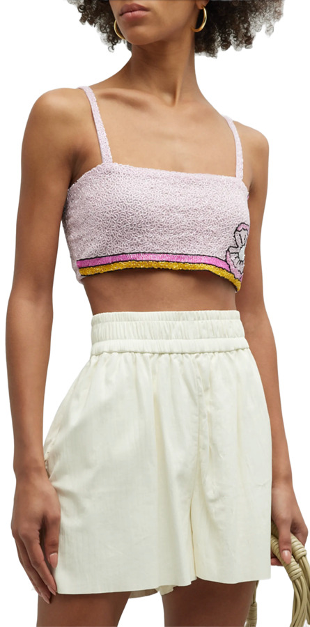Calling all disco mermaids, Monty’s here to make waves. This Oceanus co-ord is an ‘80s dream: a hand-embellished crop top dripping in Swarovski crystals and clam shell motifs. Perfect for beach clubs, dance floors, or anywhere you plan to outshine the sun.