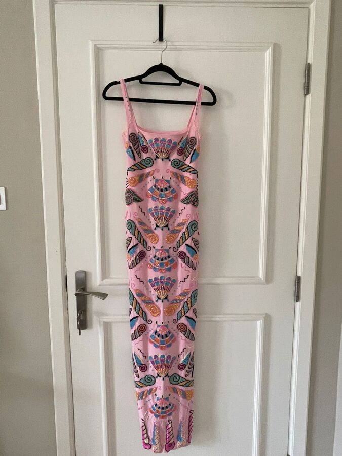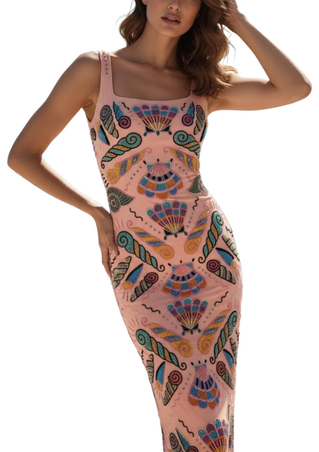 Experience elegance with the Oceanus Beaded Maxi Dress, a stunning piece adorned with signature hand-embellished detailing. This dress features intricate shell and marine-inspired motifs that enhance its pastel column silhouette, offering both a sculpted and comfortable fit. Each bead is meticulously placed to create a vibrant, mosaic-like finish that beautifully catches the light. Perfect for resort escapes, yacht days, and summer evenings when you want to make a statement.