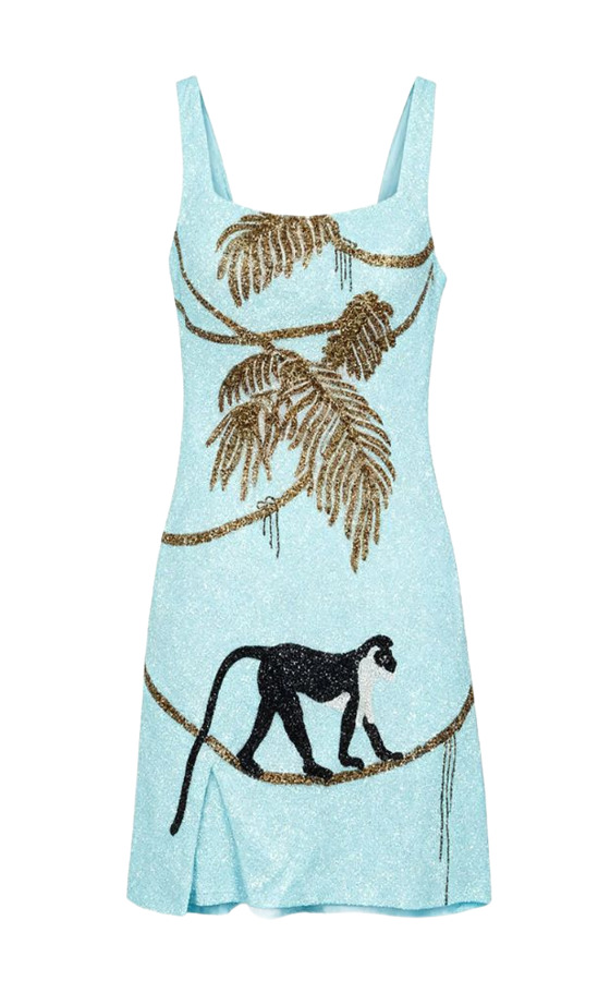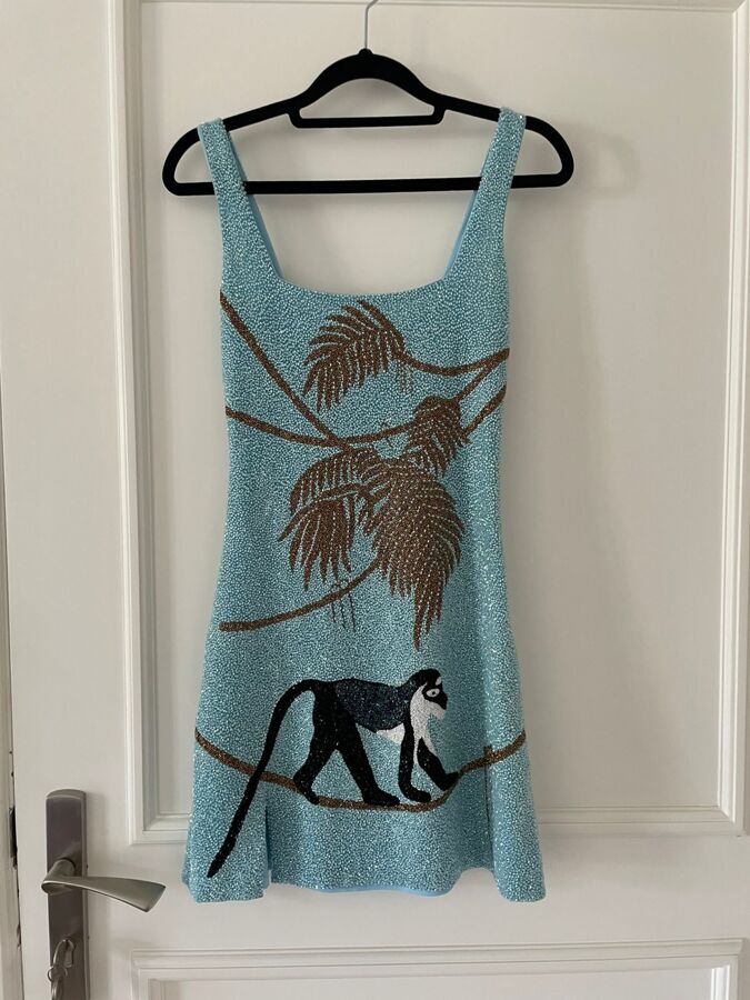 Introducing our whimsical blue hand-beaded mini dress, featuring shimmering crystal monkey and vine motifs. Crafted by skilled London artisans over 25 hours, this luxurious piece is perfect for beach soirées and sunset events. With its playful silhouette and exquisite crystal detailing, it’s a standout choice for high-end vacation wear.