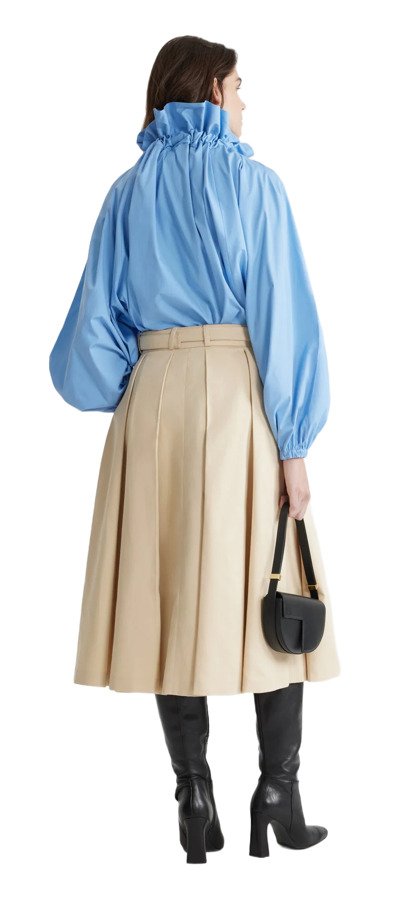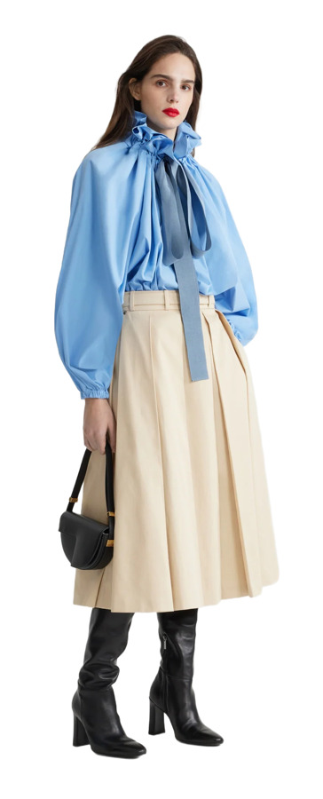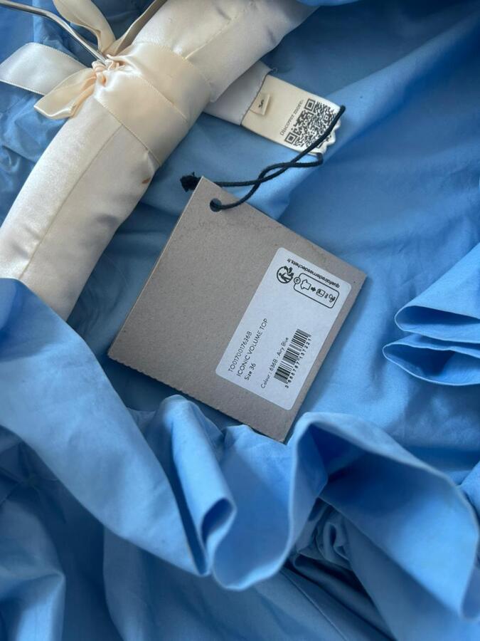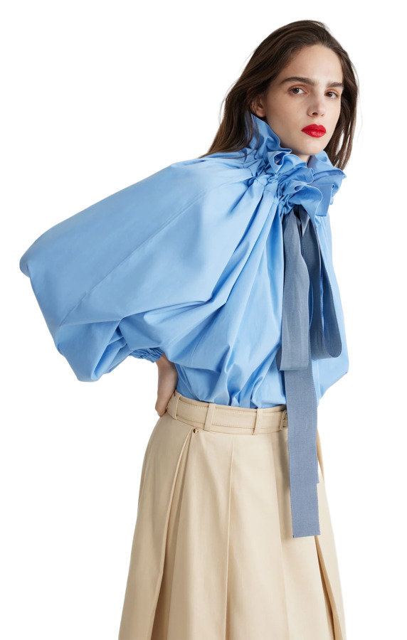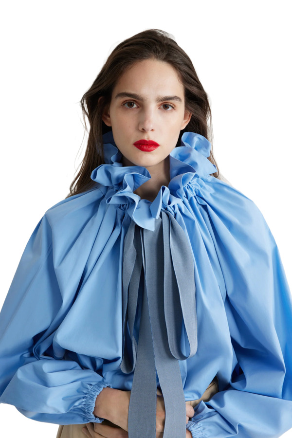 Embrace effortless style with our Airy Blue Organic Cotton Poplin Top! This high-volume top features a versatile design that can be worn knotted at the neck or off the shoulders. The drawstring collar with flounce adds a playful touch, complemented by long grosgrain ties. With batwing sleeves and elasticated cuffs, plus an elasticated waist, this top is perfect for a chic, relaxed look!