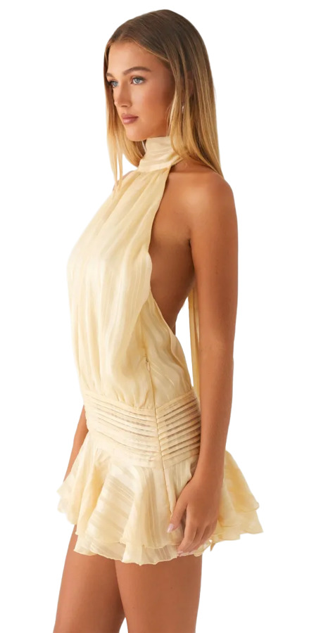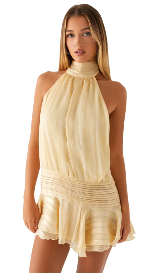Unleash your inner goddess in the Willow Chiffon Mini Dress! With a flirty halter neckline and a twirling tiered flare skirt, this beauty features a bias cut for a stunning drape. An open back adds allure, while the pleated waistband keeps it comfy. Perfect for turning heads, this dreamy dress flows effortlessly from day to night!