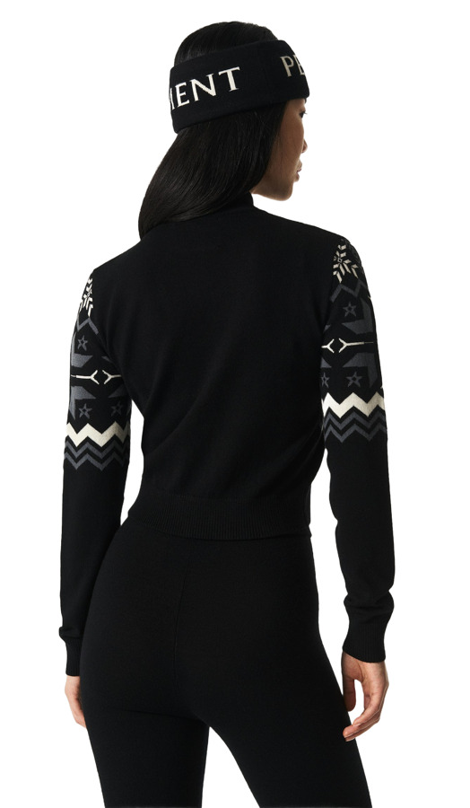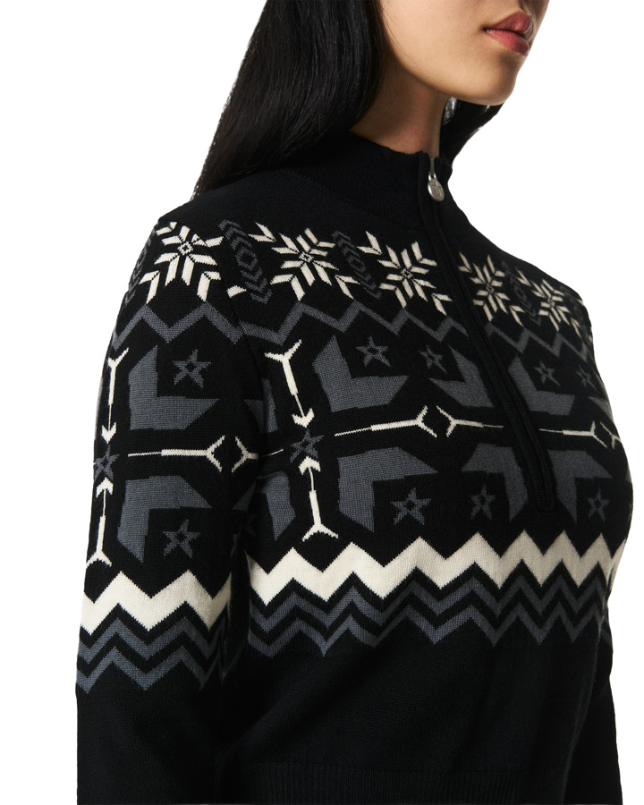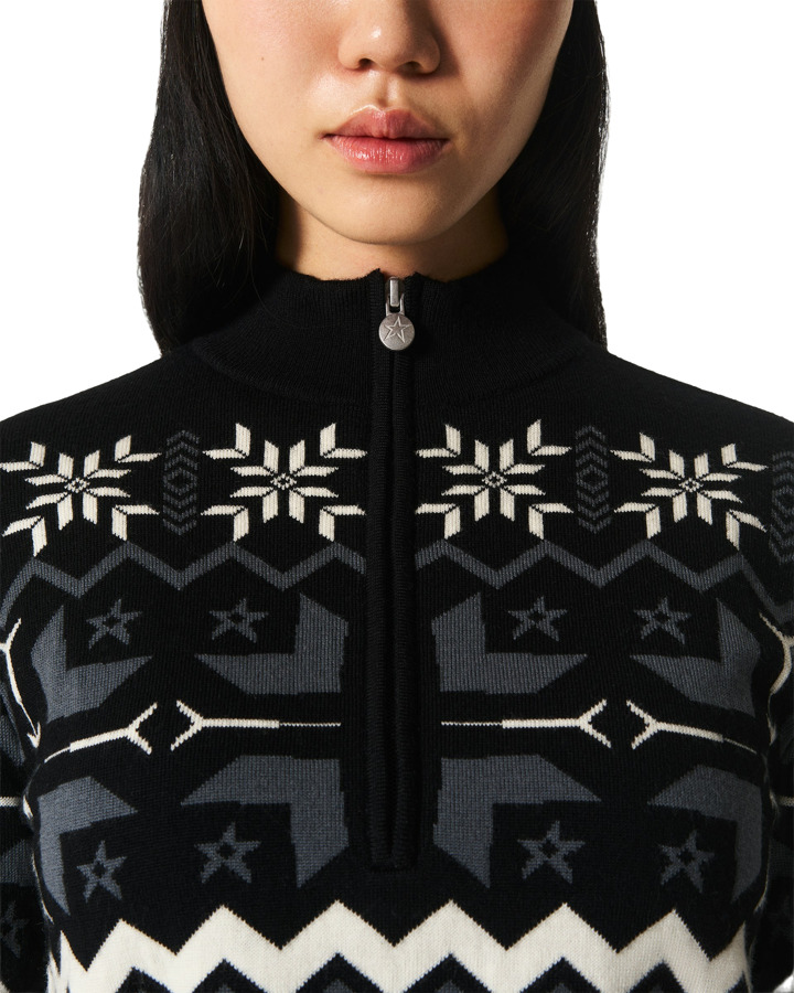 Meet your cold-weather must-have: the Nordic Sweater. Crafted from Woolmark-certified Merino wool, this slim, cropped knit features a chic half-zip mock neck and snowflake intarsia for alpine appeal. Finished with ribbed hems and long sleeves, it’s perfect for layering, lounging, and luxe winter styling—especially paired with the matching legging.