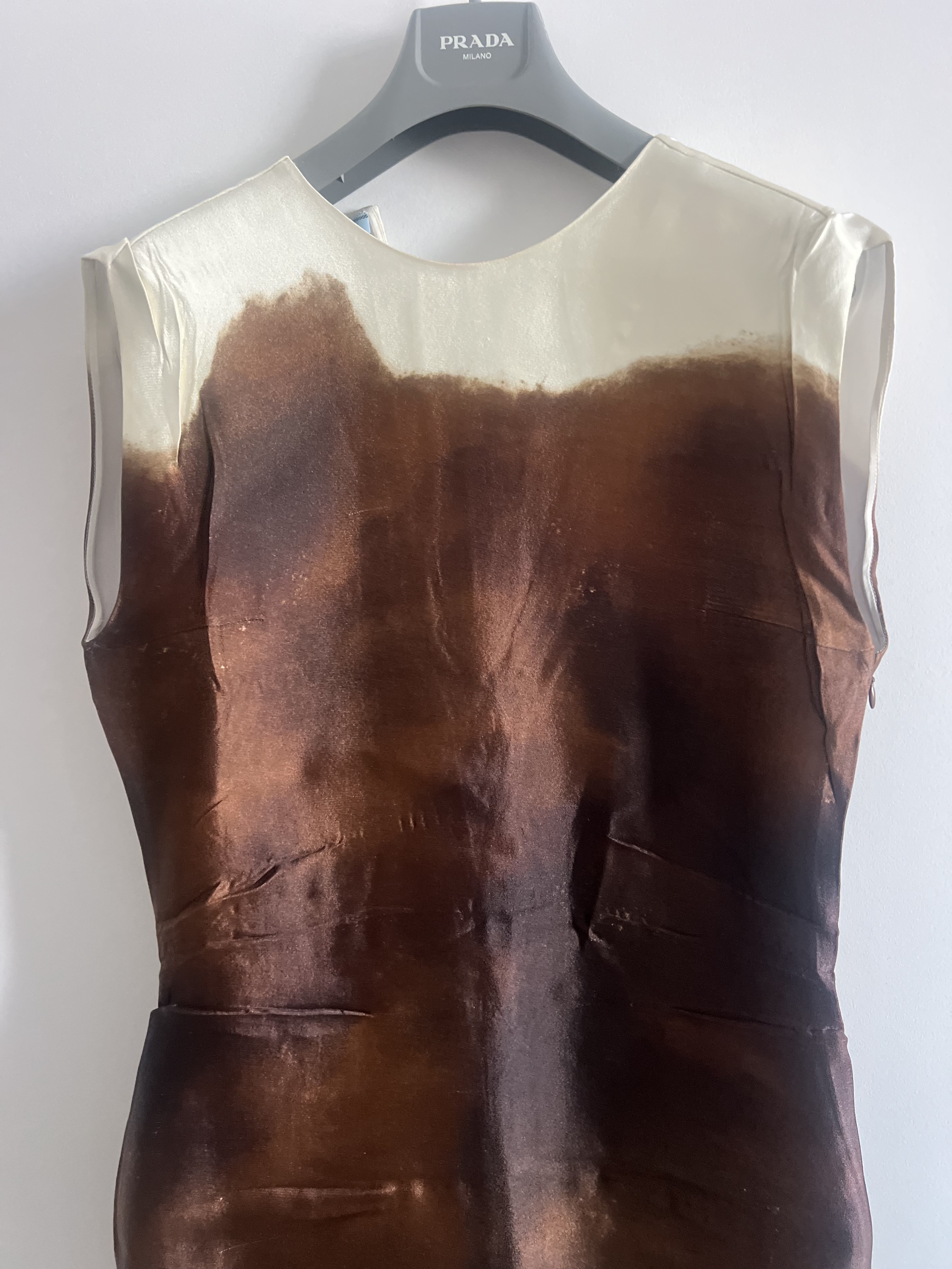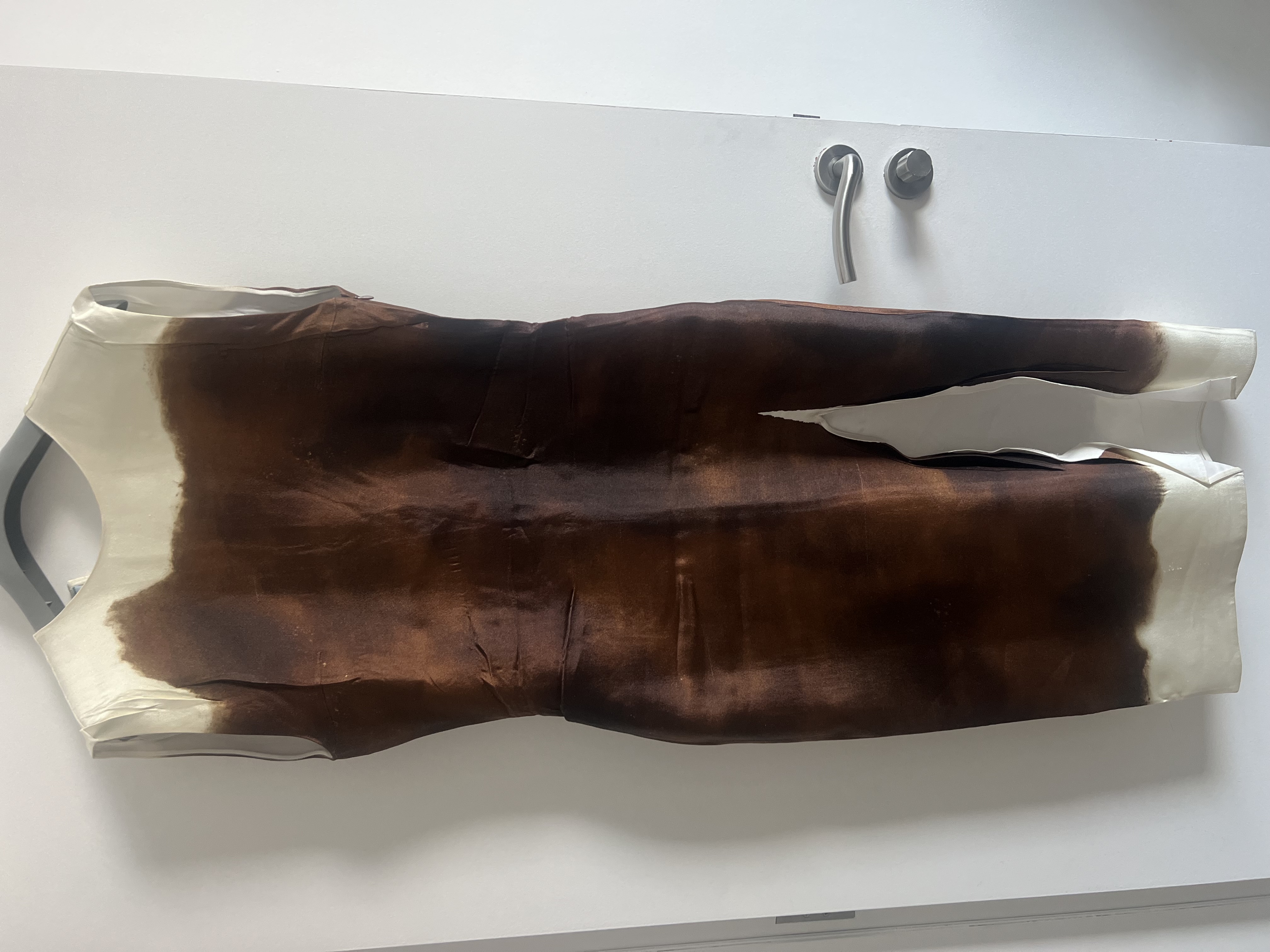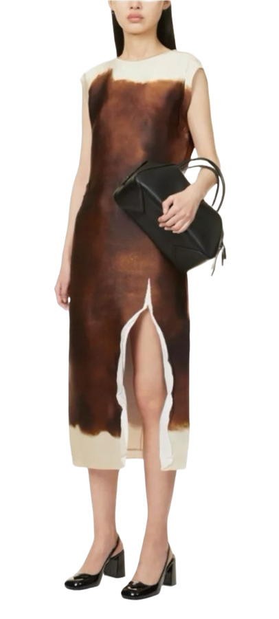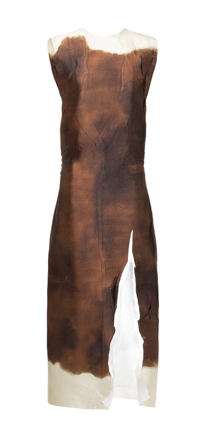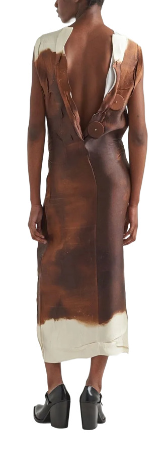This crinkled silk-blend satin dress features a unique dyed pattern printed throughout, creating a one-of-a-kind look. With a round neck and darts at the chest, it offers a flattering silhouette. The raw edge at the vented front hem adds an edgy touch, while the concealed zip closure at the side seam ensures a seamless fit. Circular appliqués adorn the low back for an eye-catching detail. Unlined for comfort, this dress in a rich burnt color is perfect for any stylish occasion.