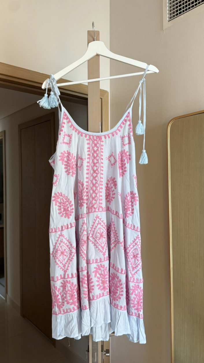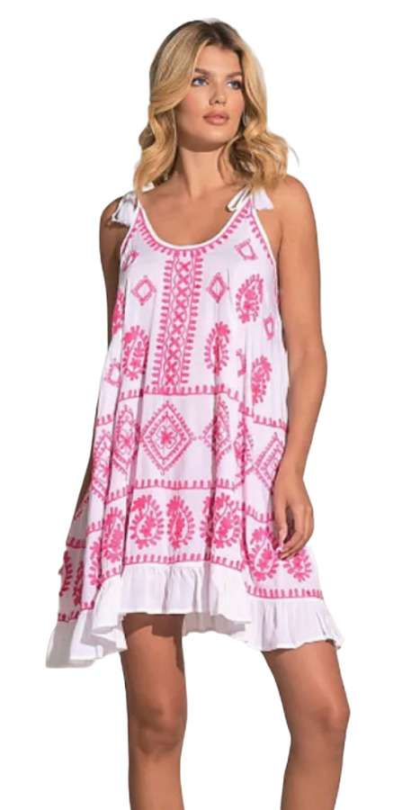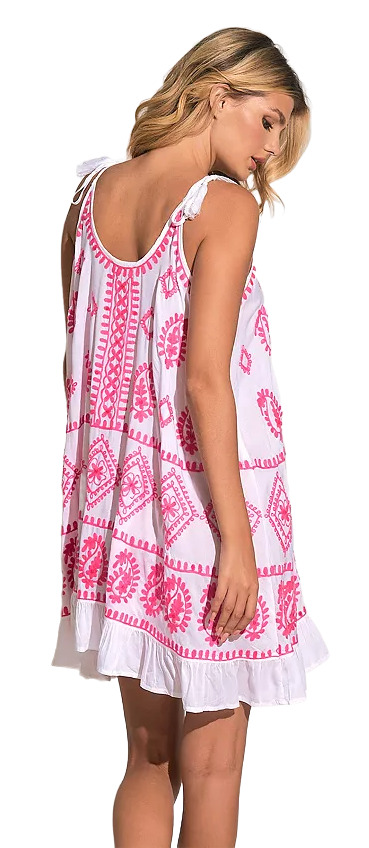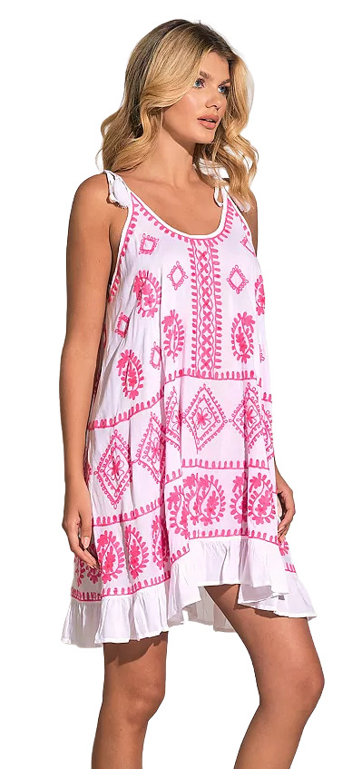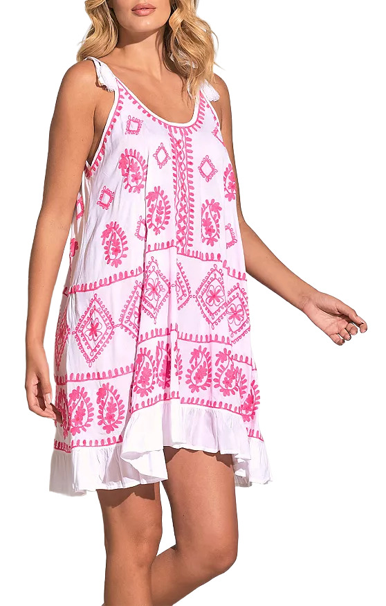 Meet effortless beach glamour: the Elan Tassel Tie Embroidered Cover-Up Dress. A scoop neckline and tassel-tied shoulders bring playful charm, while the semi-sheer embroidered fabric adds breezy allure. Finished with a flounce hemline and easy pullover style, it’s your go-to for sun-kissed, resort-ready chic.