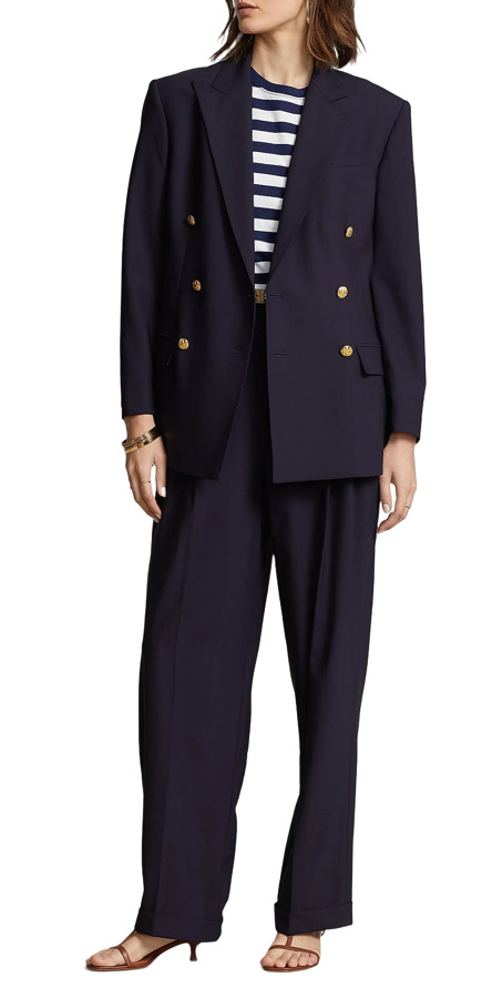 The Polo Ralph Lauren Double-Breasted Wool Crepe Blazer features a straight fit that hits at the lower hip. Crafted from stretch-infused wool, it boasts peak lapels, shoulder pads, and long sleeves with four-button cuffs. With multiple pockets and princess seams, this fully lined blazer offers a sophisticated look and comfortable feel for any occasion.