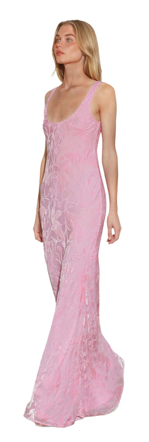 Introducing the Amaris dress, a charming devore velvet piece featuring a playful falling flower motif. Cut on the bias from smooth, figure-hugging viscose, this fully lined dress offers a sophisticated yet simple option for special occasions. With its scoop neckline, open back, and non-sheer design, it combines elegance and comfort. For the best fit, consider sizing down if you’re between sizes.