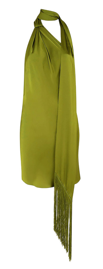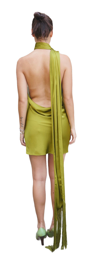 Meet Serafia—the dress that proves details are everything. This zesty, one-shouldered mini in golden cypress flaunts our iconic cowl back and a flirty, tasselled scarf you can style any way your imagination dares. Bold, elegant, unforgettable—Serafia owns every room.
