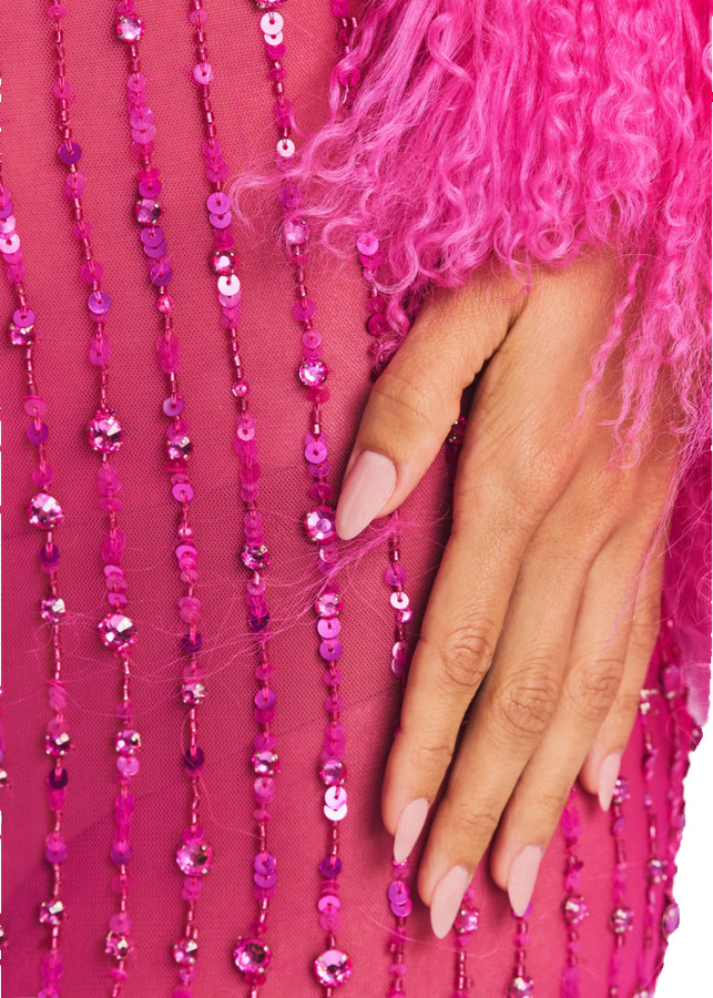Steal the spotlight in our Alessandra Dress, a stunning sheer maxi style adorned with vibrant pink embellishments. Featuring a daring thigh slit and delicate barely-there straps, this dress exudes confidence and allure. The silhouette is completed with a zippered back and a playful feathered hem, making it the perfect choice for any unforgettable occasion.
