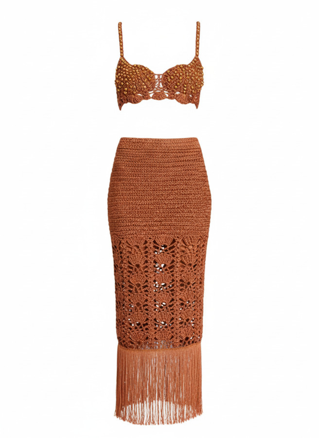 This stunning matching shell bralette and maxi skirt features intricate crochet detailing and playful fringe accents. Pair it with the matching Bellini Crochet Top for a complete festival-ready ensemble, or dress it down with a simple tank top. Shown here in Metallic Brown.