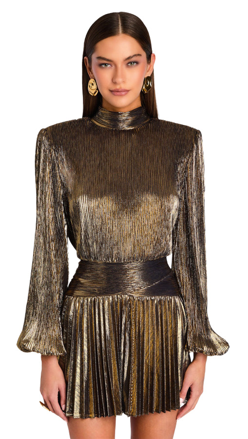 The Freja Dress delivers high-impact evening style with a polished, modern edge. Bold shoulder pads, voluminous puff sleeves, and a sleek mock neckline create a powerful silhouette, while the crossover waist flatters the figure with ease. Ideal for cocktail parties, romantic dinners, and special events, this statement dress guarantees attention. Featured here in Antique Gold.