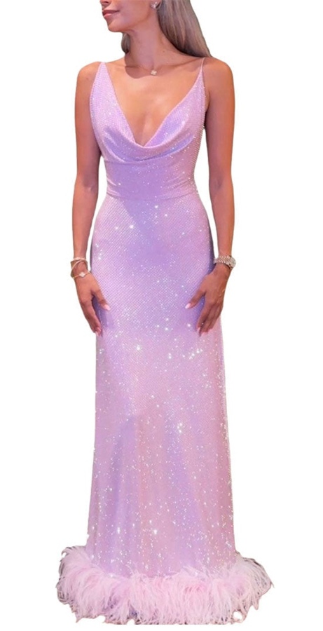 The Agora Glitter Dress boasts a stunning floor-length design featuring a cowl neckline and a form-fitting silhouette that flatters your curves. Its unique feathered hem adds a dramatic flair, while the deep open back enhances its elegance. This dress is the perfect choice for those seeking to make a statement at any formal event.