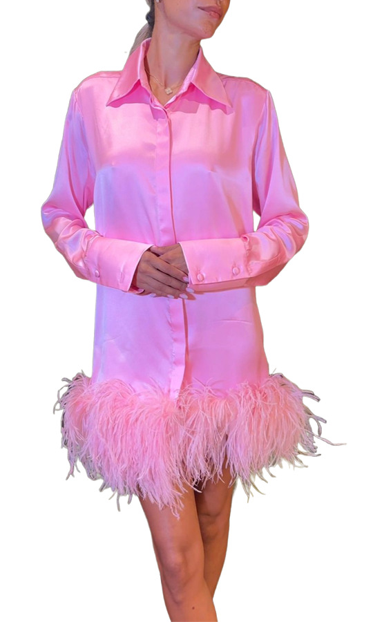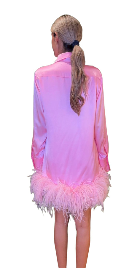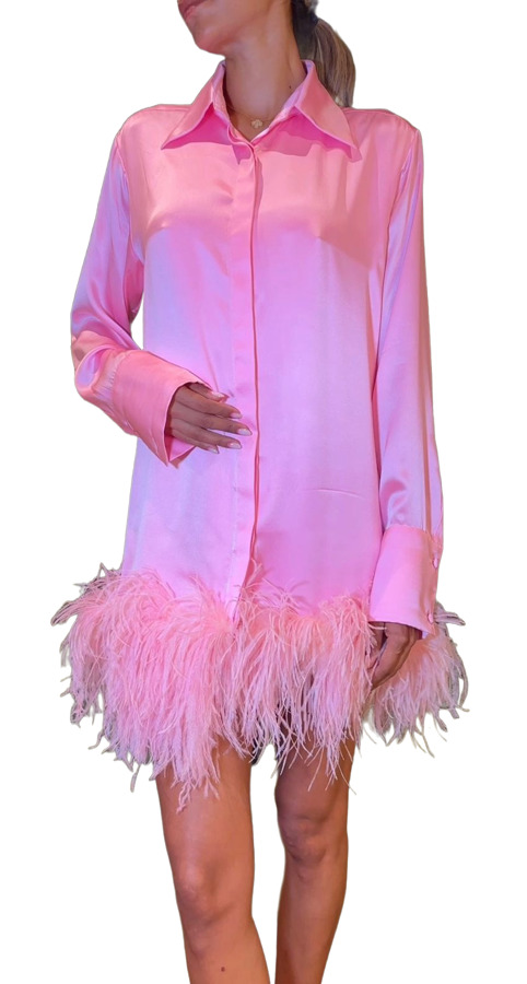 Expertly crafted, the Amanda Shirt Dress in Pink showcases intricate feather accents for a sophisticated flair. Featuring a button-up front, collared neckline, and cuffed sleeves, this dress offers a polished finish, making it an elegant choice for any occasion. Elevate your style with this chic piece!