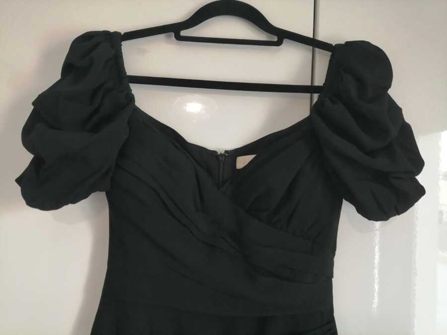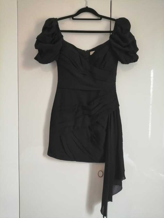 The Diana Mini Dress in black features a romantic sweetheart neckline and a pleated front with draped waist detail. Its gathered puff sleeves, complete with elasticized cuffs, offer versatility for on- or off-the-shoulder styling. Perfect for a night out, this sophisticated Ronny Kobo mini ensures a flattering fit with its elegant silhouette and side-tie sash.