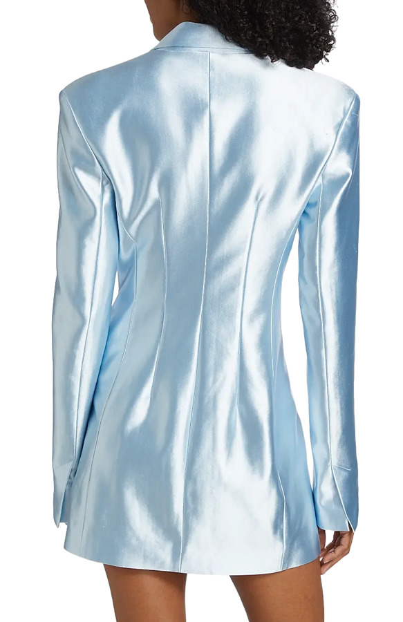 Make a statement in the Rotate Birger Christensen Double-Breasted Minidress! Crafted from glossy satin, this tailored piece features a stylish double-breasted silhouette with peak lapels and long sleeves with split cuffs. The chic chest welt pocket and button front detail add sophistication. Made from a comfortable blend of 95% polyester and 5% elastane, with a lining of 92% polyester and 8% elastane, this minidress is perfect for any occasion! Can also double as a Blazer with the matching top and trousers.
