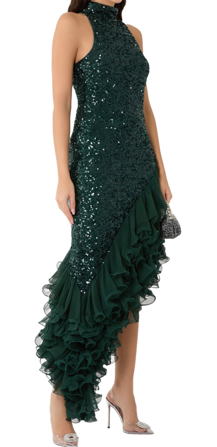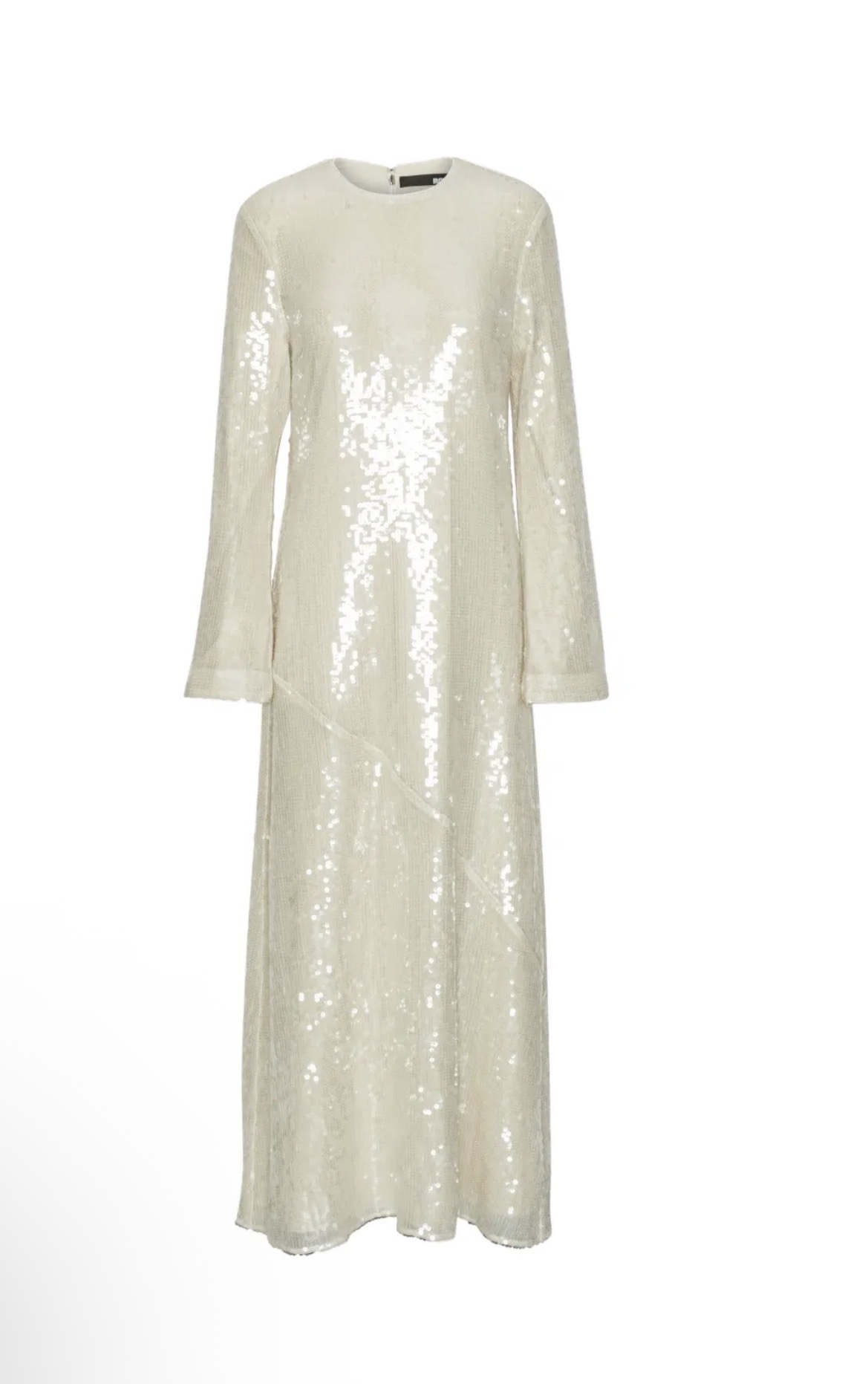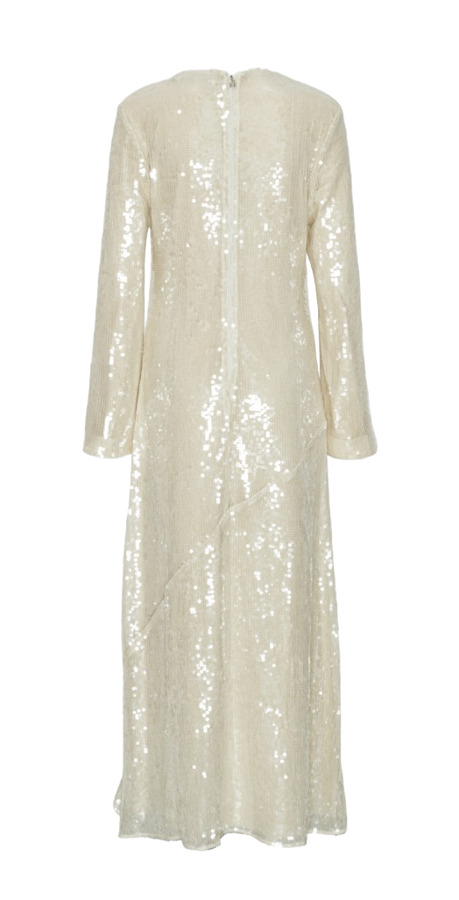 The sequined maxi dress in off-white features a full-length silhouette with long sleeves and a round neckline. Adorned with all-over sequins, it showcases an asymmetrical seam detail for added flair. Fastening with a concealed back zipper, it ensures a smooth fit, making it a glamorous choice for any elegant occasion. Perfect for making a memorable impression!