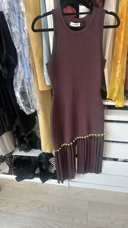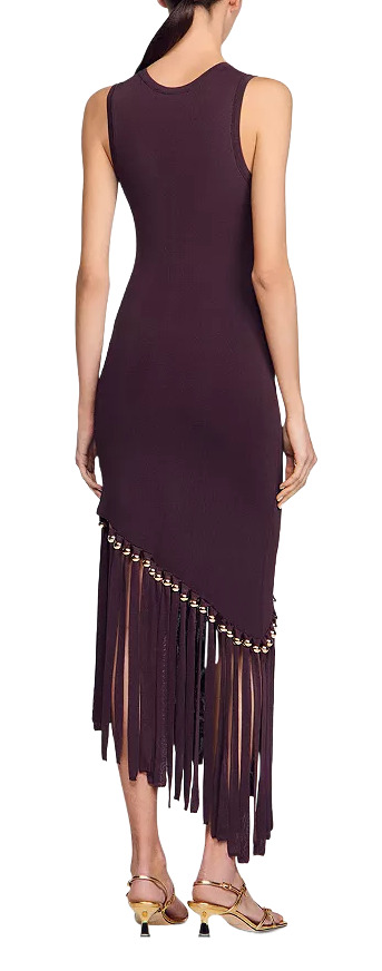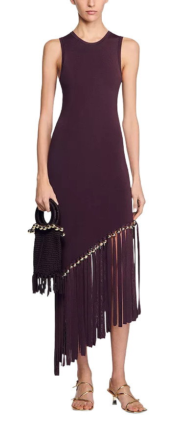 Elevate your style with the Sandro Maroon Beaded and Fringe Midi Dress! This fitted midi dress features a luscious chocolate brown hue with a hint of purple, crafted from stretchy material for a flattering fit. Adorned with striking gold beads and fringe at the bottom, its asymmetrical cut adds a touch of drama. Complete with a crew neck and sleeveless design, it's perfect for any occasion!