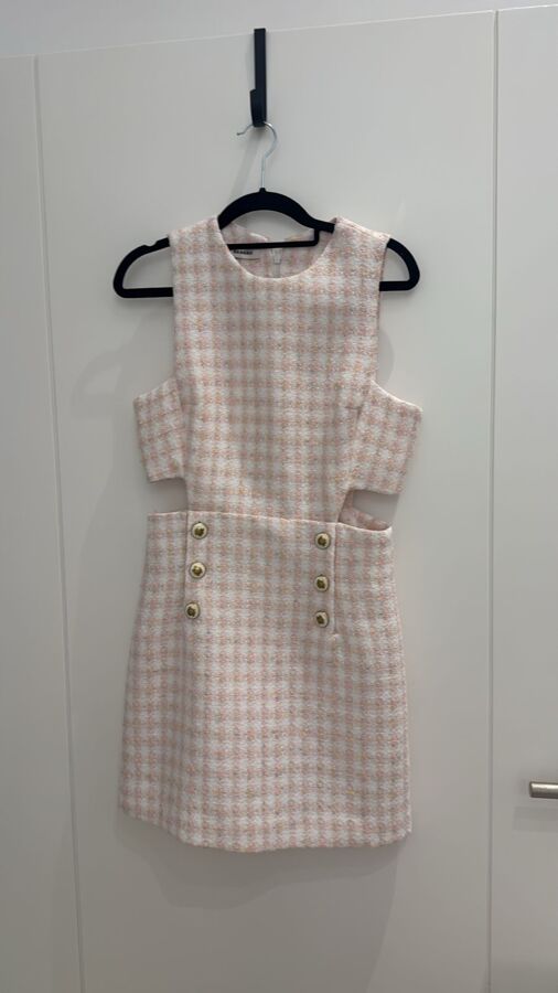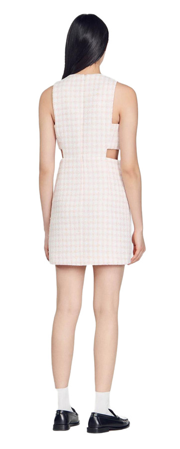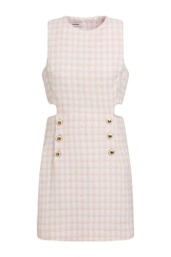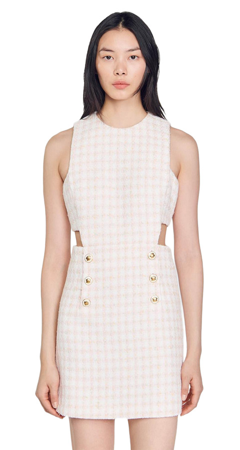 The Sandro Tweed Dress captivates with its shimmering metallic tweed and striking cutouts. Button details add a unique touch, while the concealed zip at the back ensures a seamless fit. Fully lined for comfort, this mid-weight, non-stretch dress is perfect for making a statement at any special occasion!