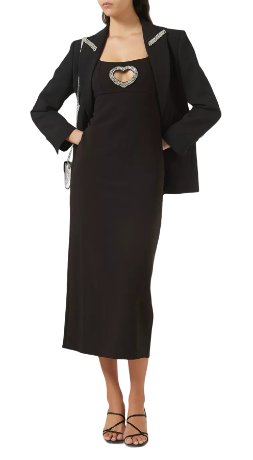 The Sandro maxi dress brings a bold flair to evening wear. Its rhinestone-embellished heart cutout and corset-style detailing create a confident fusion of structure and sparkle. This striking design ensures you stand out, making it the perfect choice for a memorable night out. Elevate your evening style with this statement piece.