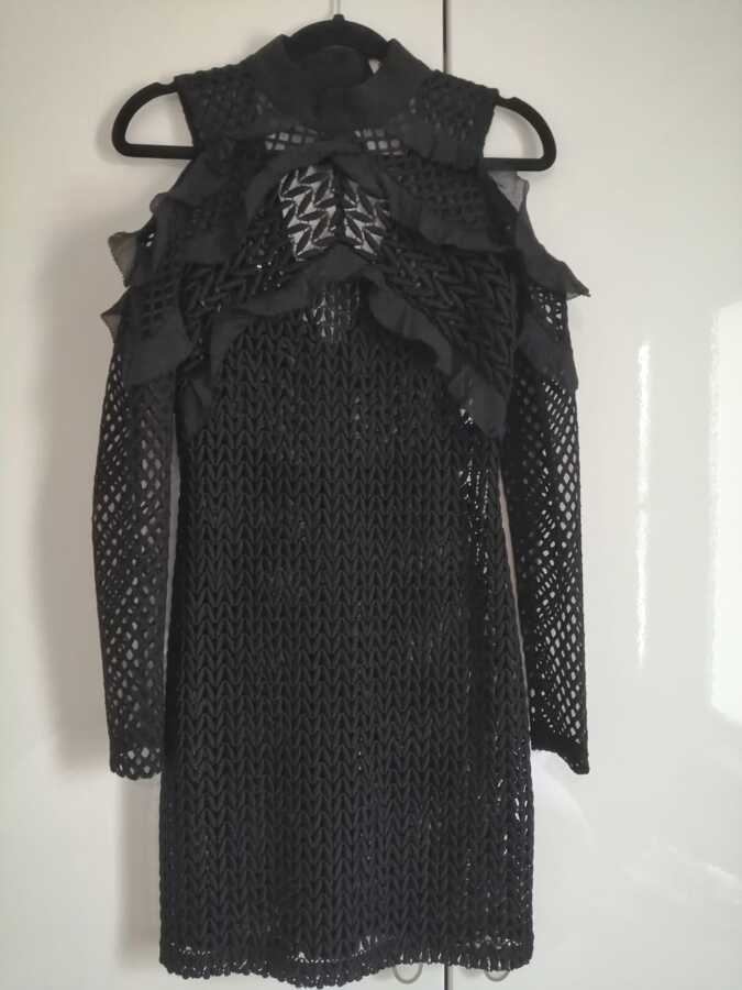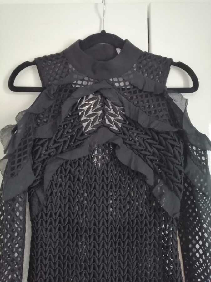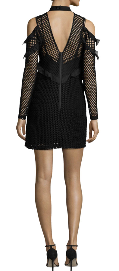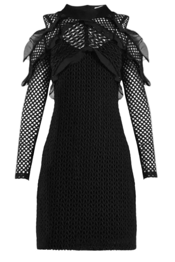 The Self-Portrait Purl Knit Lace Cut-out Shoulder Dress features a sheer lace design with diamond-mesh long sleeves and cut-out shoulders. It has a close-fitting crepe round neck, a deep V-back, and three-tier organza ruffles. A center-back zip fastening provides a secure fit, while the additional black crepe slip lining enhances comfort and elegance.