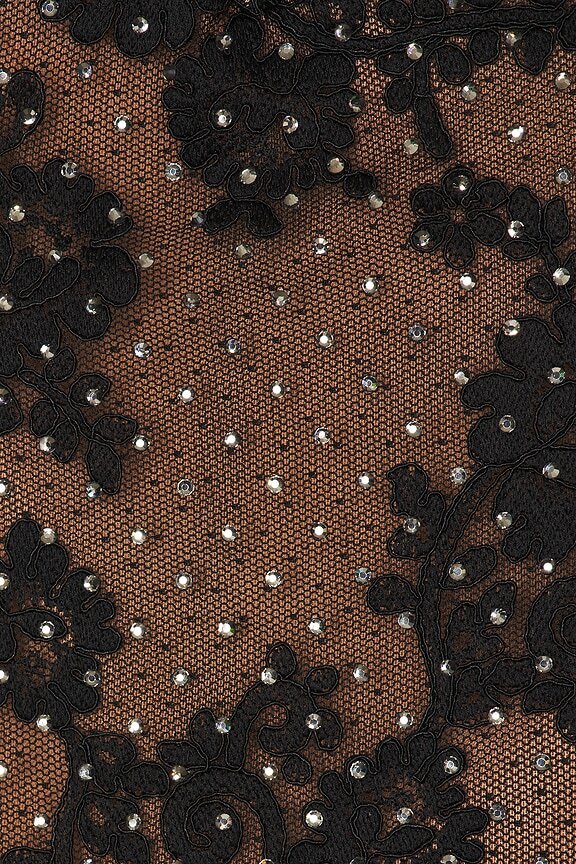 The Self-Portrait Rhinestone Maxi Dress features a deep V-neck design with a boned bodice and underwire cups for support. It has a partially lined silhouette crafted from midweight lace sequin fabric. A hidden back zip with hook and eye closure ensures a secure fit, while the non-stick silicone grip trim adds comfort, making it perfect for special occasions.