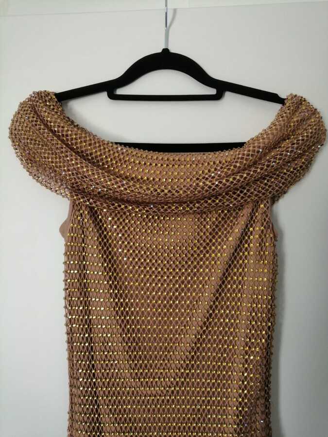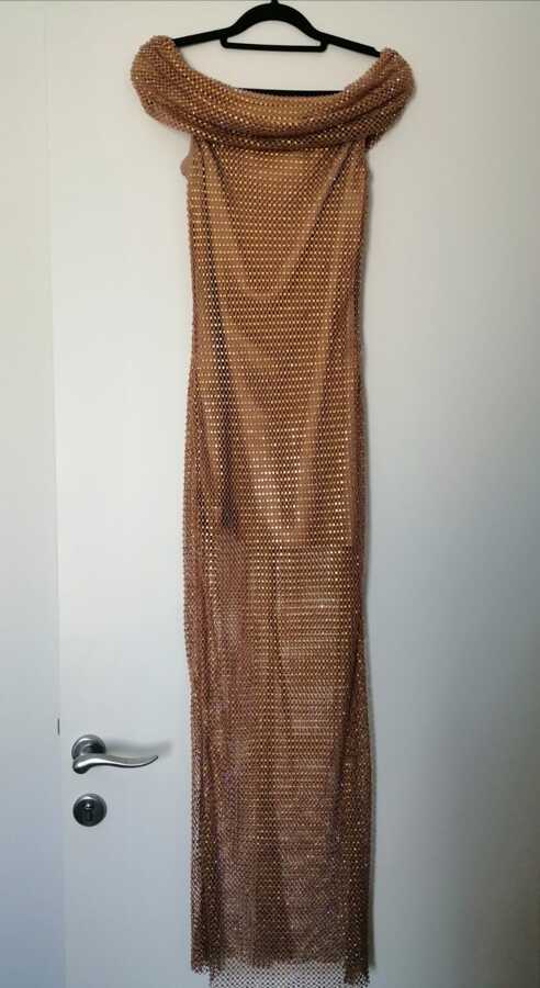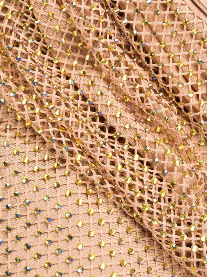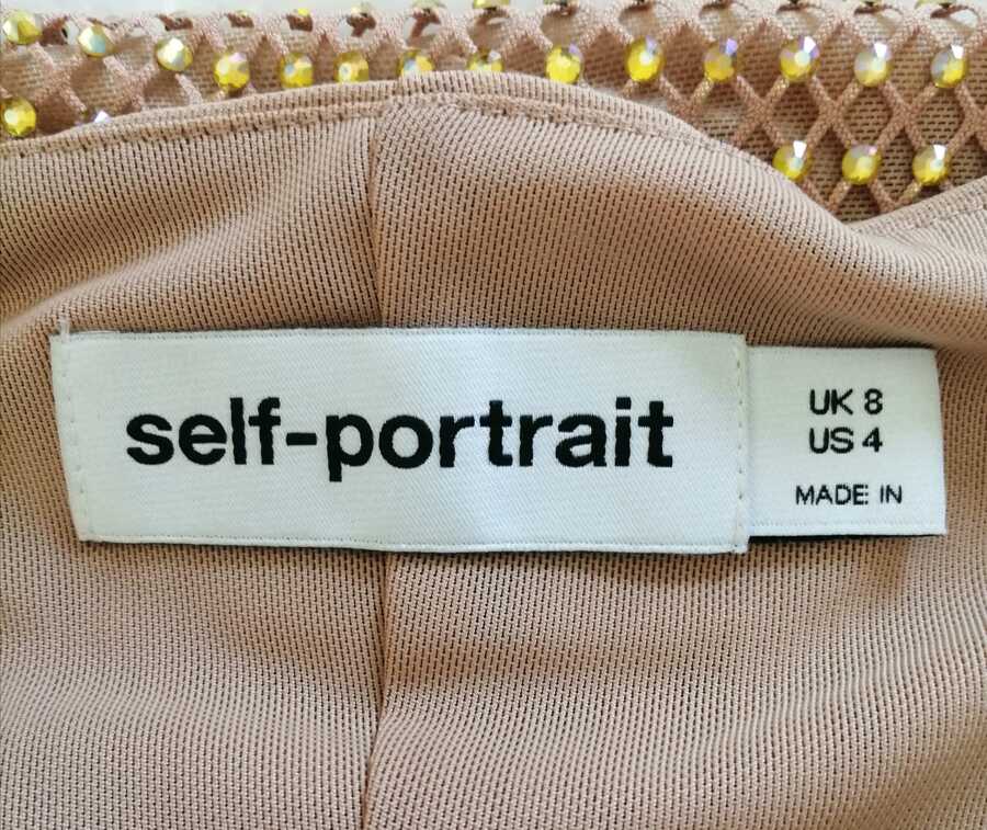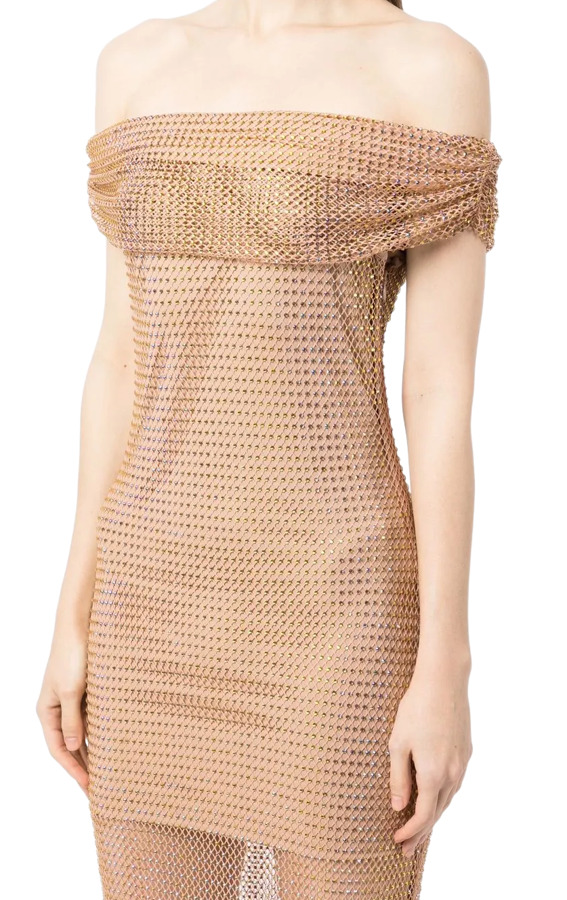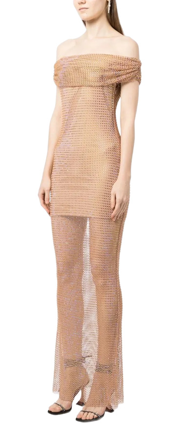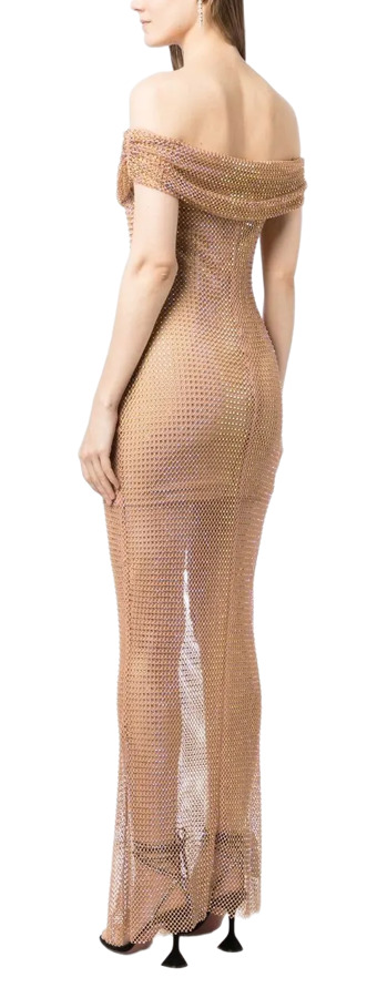 The Self-Portrait rhinestone-embellished maxi dress features a stunning beige metallic finish, adorned with eye-catching rhinestones. With a flattering Bardot neckline and sleeveless design, it exudes elegance. The side zip fastening ensures a secure fit, making it perfect for special occasions where you want to make a statement.