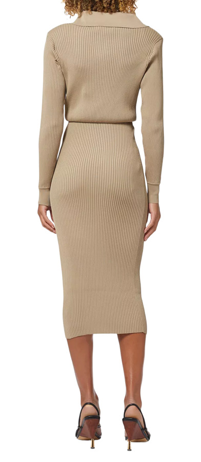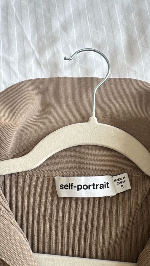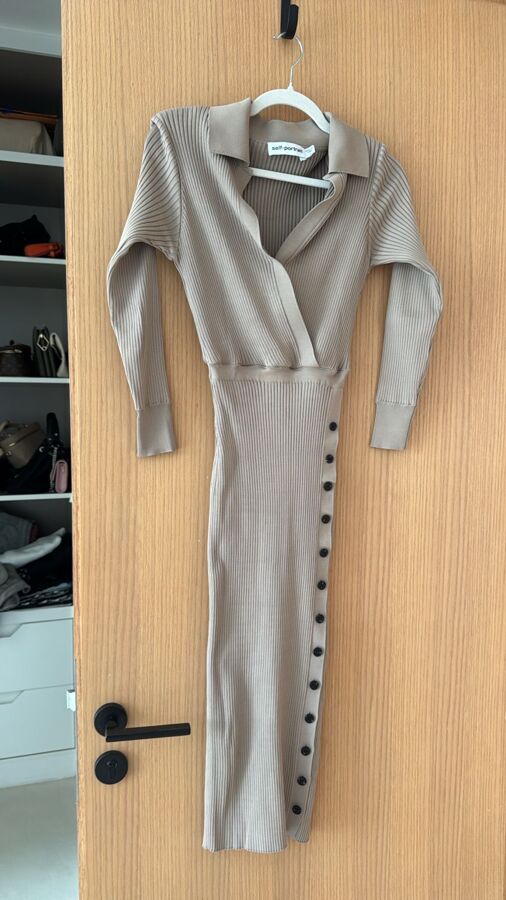 Self Portrait's cleverly tailored wrap dress exudes contemporary cool. Designed to mimic a two-piece look, the ribbed fabric wraps comfortably around the body. It features a chic spread collar and contrasting button details. Style your hair in a chignon to highlight the feminine V-neck and complete the outfit with sleek black mules for a sophisticated finish.