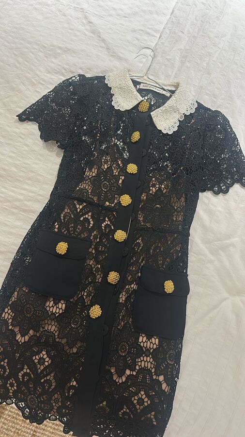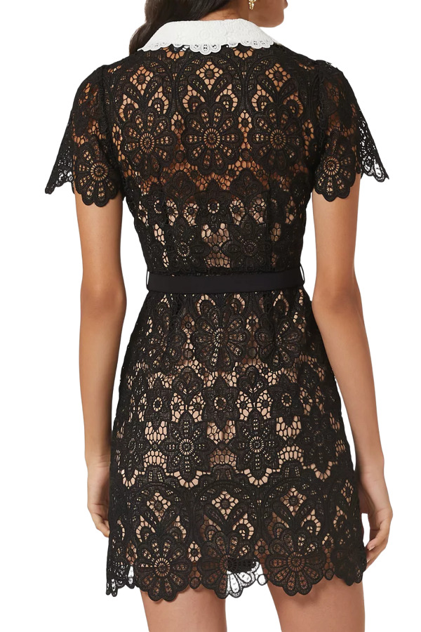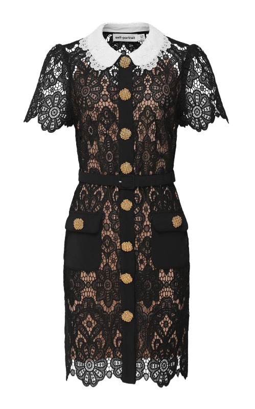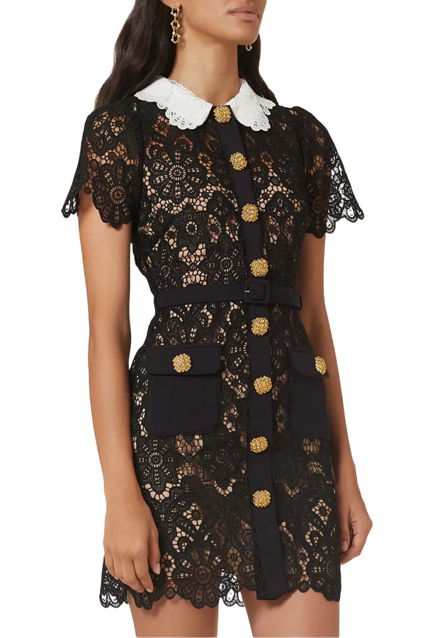 The Floral Guipure Mini Dress by Self-Portrait redefines the classic little black dress with a refreshing twist. Featuring a statement collar and chic gold button fastenings, it exudes elegance. Pair it with gold jewelry for your next brunch date and be ready to turn heads—effortlessly stylish and oh-so-fabulous!