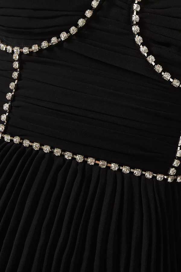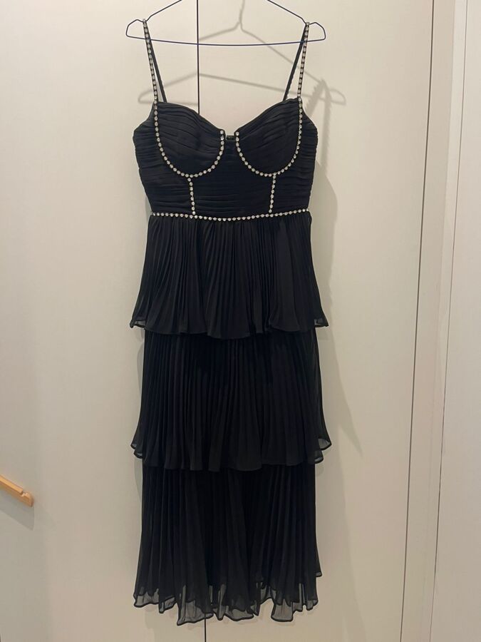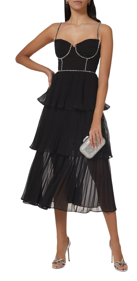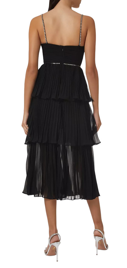 The Self-Portraits Timeless Black Dress is an instant classic with captivating detailing. Crafted from voluminous chiffon pleats, this midi dress features a diamond-lined bustier and a triple-tiered skirt. Its fitted waist highlights your figure, while the flowing skirt moves gracefully with every step you take. Perfect for making a bold statement at any event!