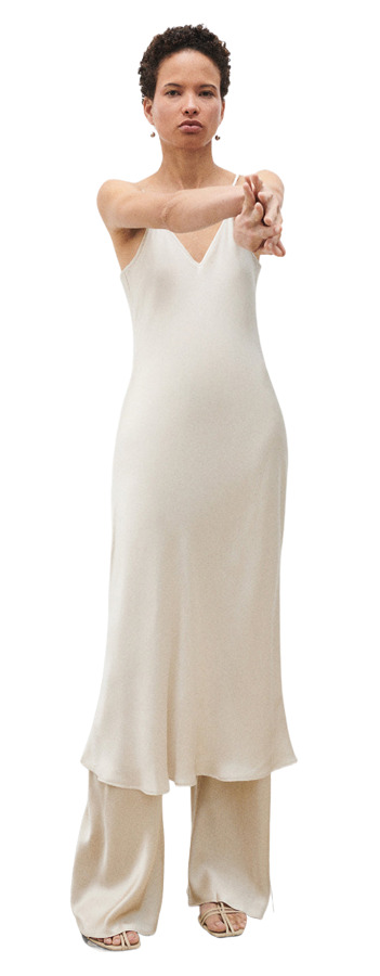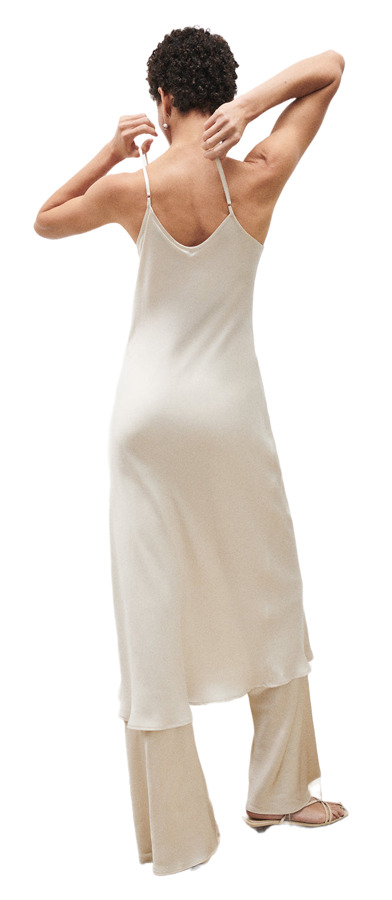 The Slip Dress in Hazelnut is made from 100% silk and features a round neckline, adjustable straps, and a bias-cut silhouette that gracefully falls to a mid-length hemline. This timeless and elegant piece is a must-have wardrobe essential, offering versatility for any occasion.