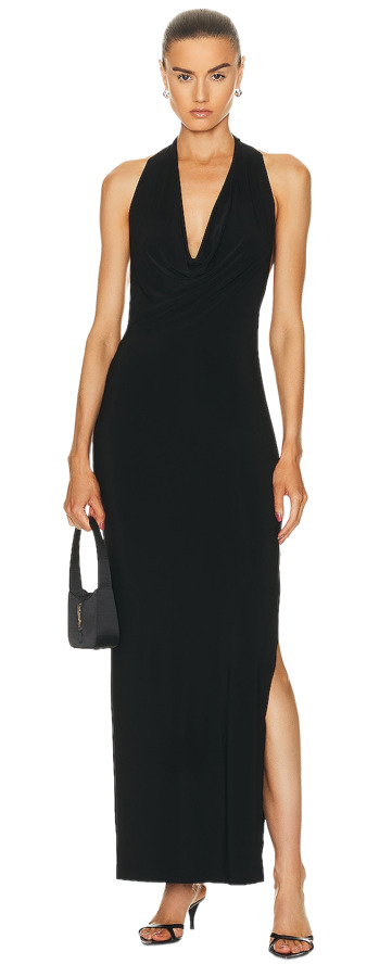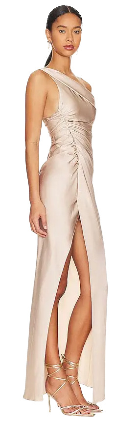 Shine without trying in the SIMKHAI Sahar Off-Shoulder Gown in Metallic Gold. This sleek, unlined stunner features an effortless off-shoulder neckline, ruched waist, and a sultry side-seam split. Crafted from midweight sateen, it drapes like liquid gold—elegant, modern, and made for every spotlight moment.