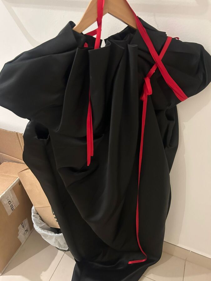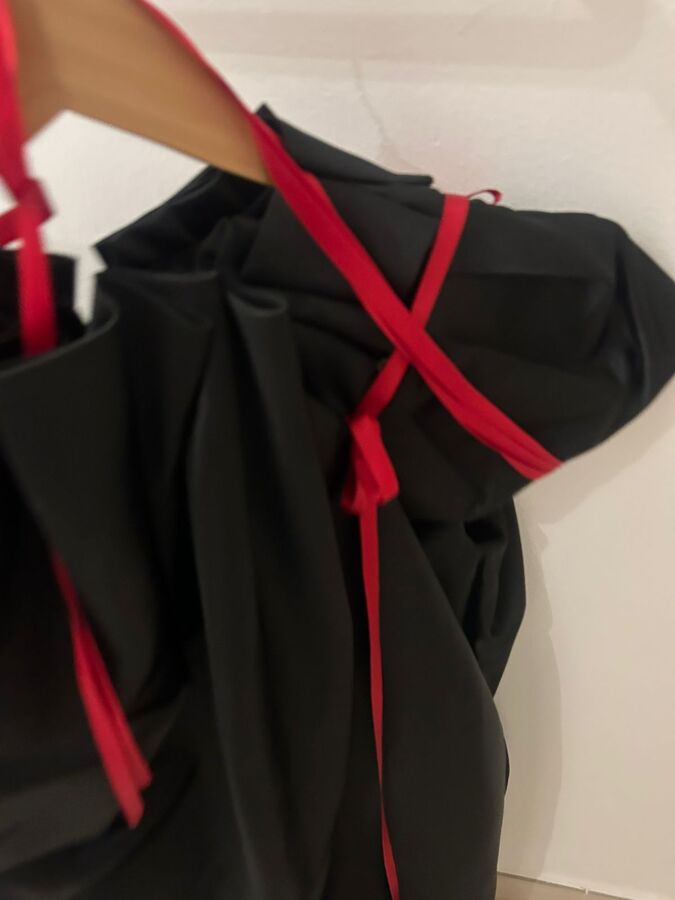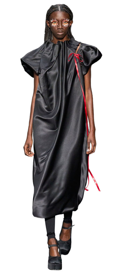 Make a statement with the Ruched Bow-Detail Satin Dress in black, featuring a stylish round neck and exquisite front and back knot appliqué. This elegant design includes set seam pockets and hollowed-out shoulders, complemented by cover sleeves. The back zip closure and center slit add sophistication, while the full satin lining enhances comfort. A standout piece from the SS24 show!