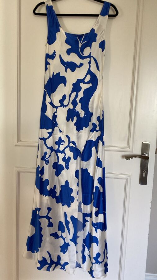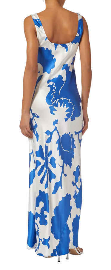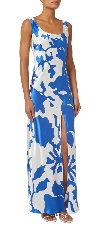 Sir. The Label’s Esme dress is a silk-draped floral maxi with crisp, bold colors. The simple scooped neckline and floor-skimming skirt—with a flirty slit—let the print do the talking. Effortless, elegant, and endlessly wearable for any sunlit affair.