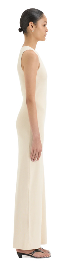 The Kinetic Beaded Maxi Dress in natural ecru is crafted from a midweight, body-hugging compact knit with generous stretch. This sleeveless, full-length silhouette features a plunging neckline and a marbled cut-out detail that adds a modern, sculptural touch. Designed to flatter with a slim fit, it pairs effortlessly with minimal heels for an elevated look.