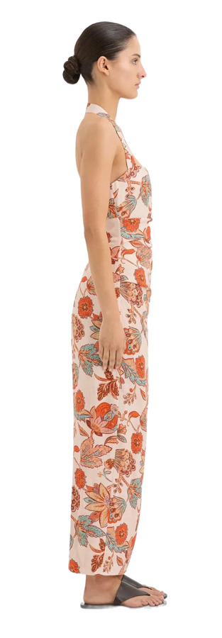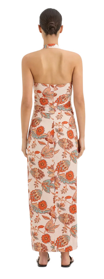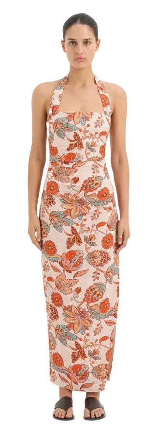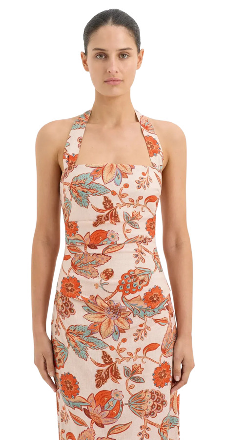 The SIR. Noemi Halter Midi Dress is crafted from lightweight, non-stretch linen with a charming floral print. It features ruching details, a side slit, and a square neckline, complemented by a fixed halter strap. The dress includes a hook-and-eye and hidden zip closure at the side and is fully lined with 100% cotton for added comfort. Perfect for any occasion!