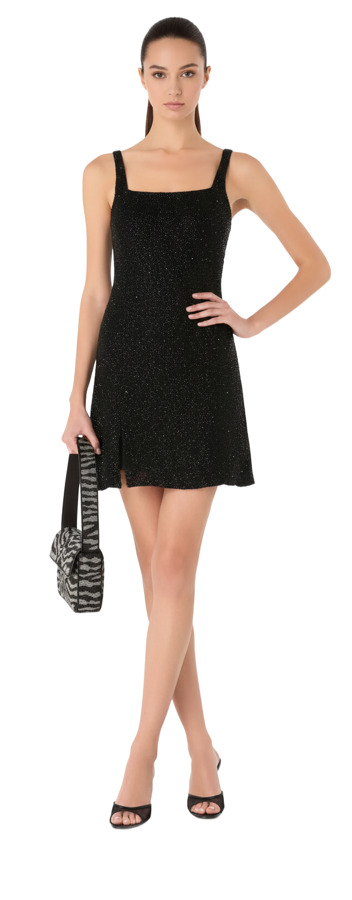 Get your glam on with this rib knit stretch modal dress featuring a sparkling glitter effect throughout. With its crewneck and racerback design, it's a chic choice for any occasion.