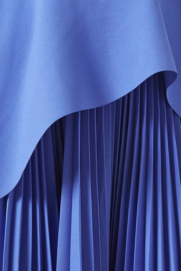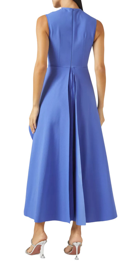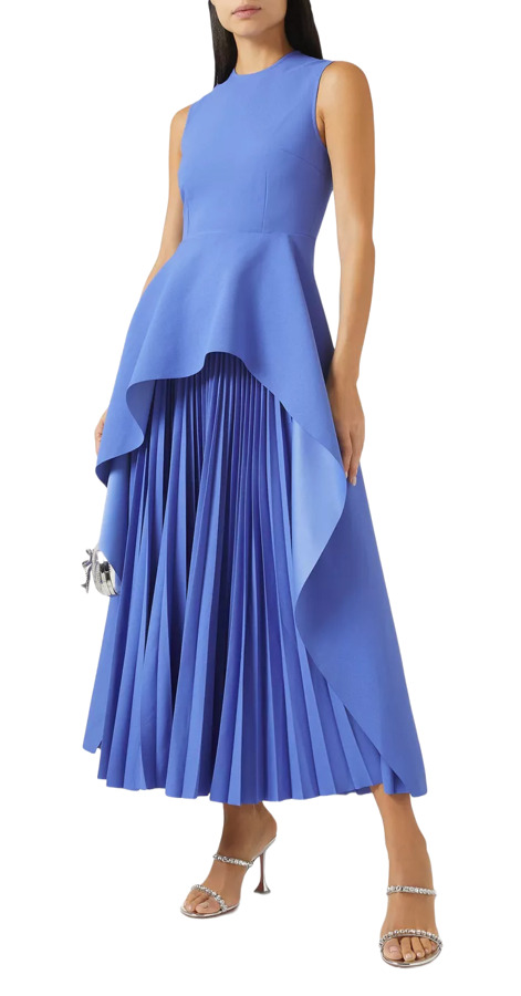 The Severny Midi Dress defines modern elegance with a refined, fashion-forward edge. Featuring a sculptural draped asymmetric peplum, it creates a striking silhouette, perfectly balanced by a contrasting sunray pleated skirt that moves with effortless grace. Contemporary, polished, and undeniably sophisticated.