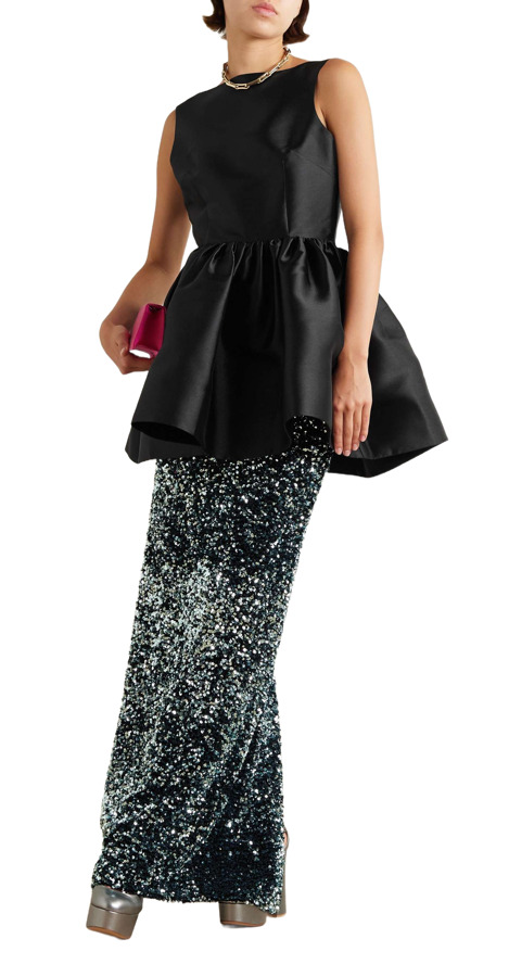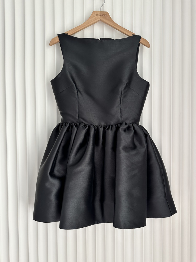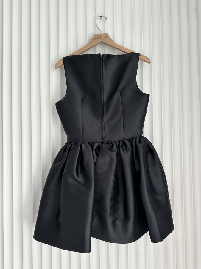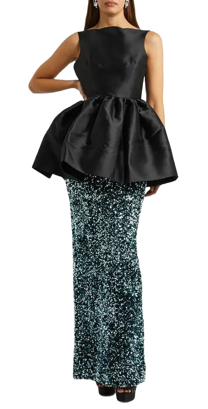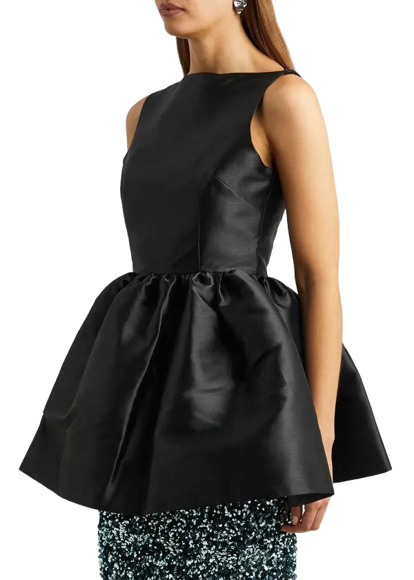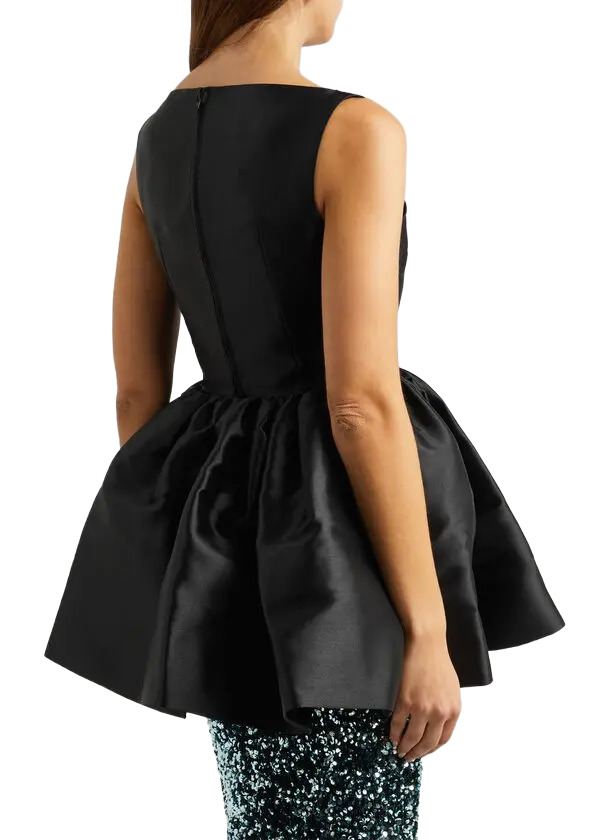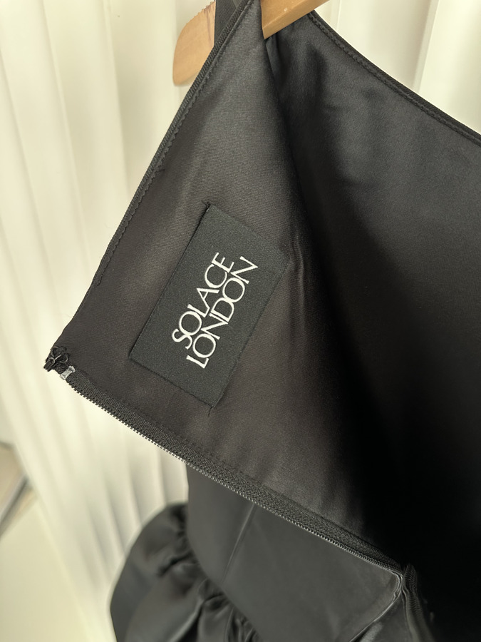 Show off your style with the Simona Top from Solace London! Crafted from luxe black satin-twill, this top features a chic boat neck and fitted bodice that flares into a voluminous peplum hem. With dart detailing, gathered accents, and a flared ruffle hem, it's perfect for turning heads. The concealed rear hook and zip add a sleek finish!