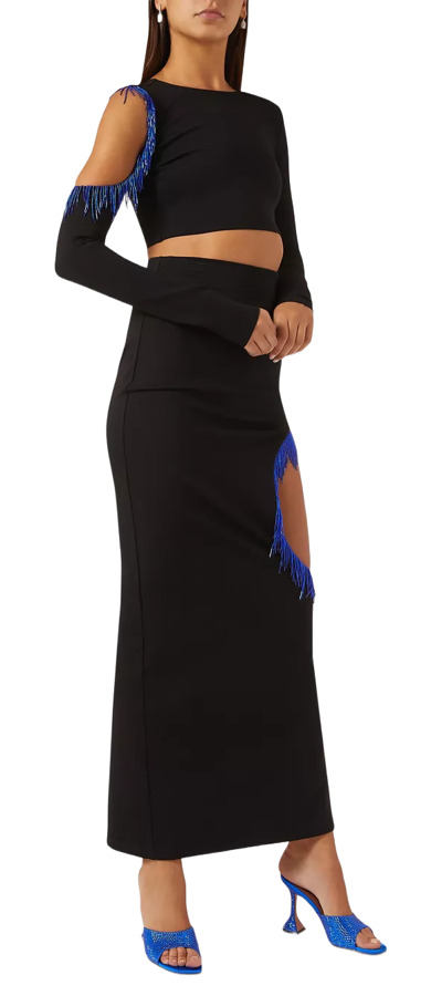 Staud reimagines the classic with the Ellen Top and Scarlett Skirt Set, blending playful elegance and festive flair. The Ellen top, crafted from ponte knit, contours your figure and features strategically placed cutouts adorned with beaded fringe trim that adds lively movement. The matching Scarlett skirt, with its maxi silhouette and back zip, also showcases the stunning fringe detailing, ensuring all eyes are on you as you twirl through the night!