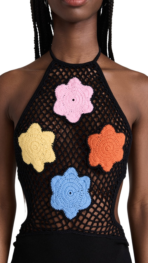 The Jacqueline Dress by Staud is crafted from mid-weight crochet and slinky ribbed knit. It features beautiful crochet floral appliqués at the bodice and a tie halter neckline. A stylish cutout at the back adds a touch of allure. Made from a blend of 65% viscose and 35% nylon, this dress perfectly balances comfort and elegance.