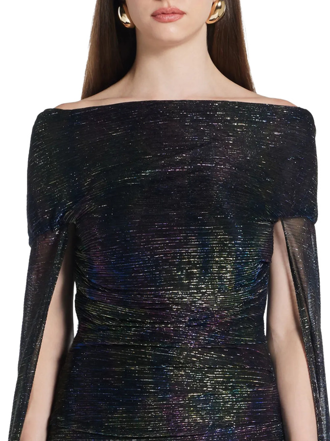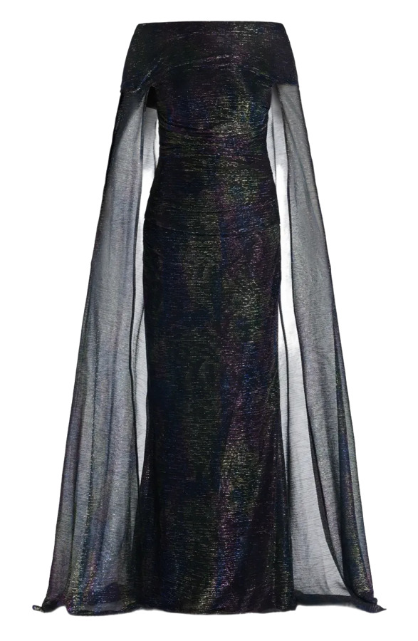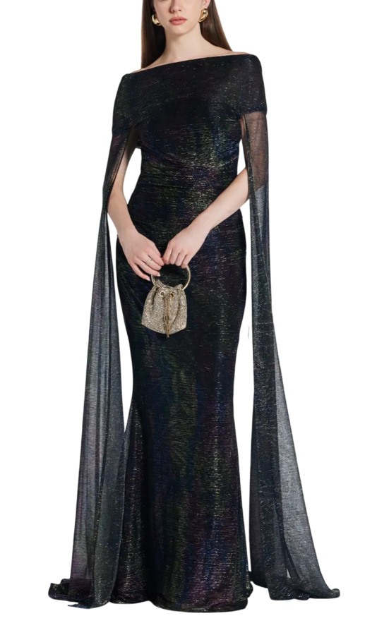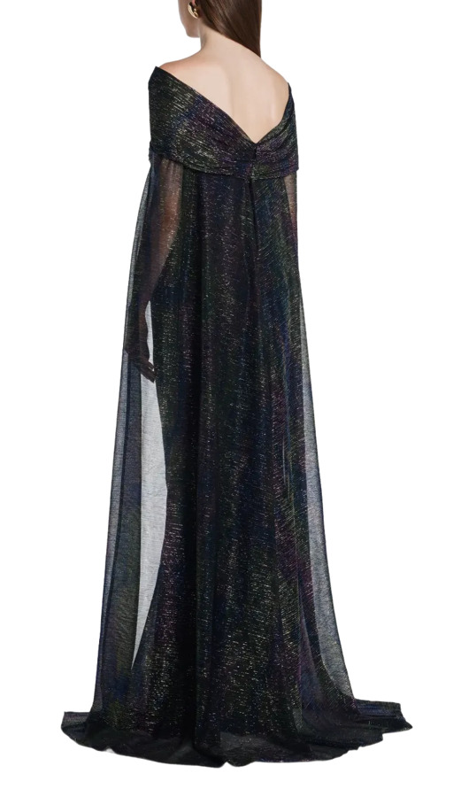 Capture elegance with the Talbot Runhof Off-Shoulder Cape Dress in dark blue. This stunning floor-length gown features an off-shoulder style with a dramatic cape detail for a chic silhouette. The ruched detail adds texture, while the train enhances its sophistication. Perfect for making a statement at any special occasion!