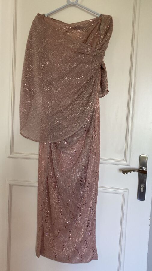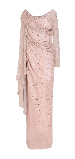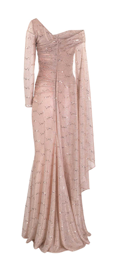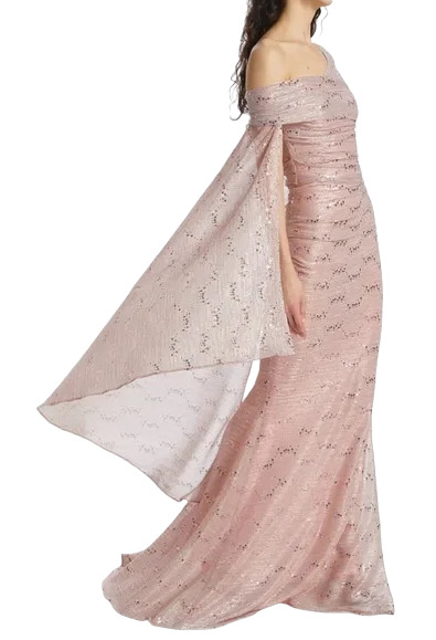 Steal the spotlight in Talbot Runhof's stunning off-the-shoulder voile gown! With one chic short sleeve and a dramatic draped cape sleeve, this piece sparkles with lustrous sequin embroidery. The concealed back zip ensures a seamless fit, while the luxe lining (85% cupro, 15% elastane) offers comfort in style. Perfect for making a show-stopping entrance!