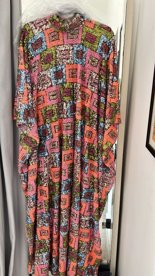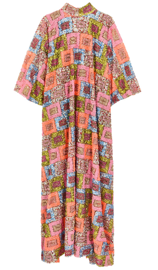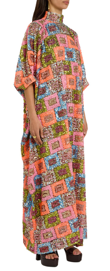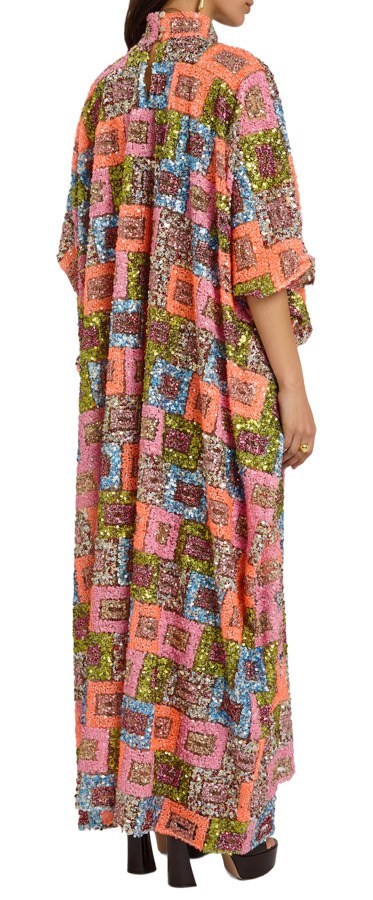 Float through the night in Taller Marmo’s chiffon kaftan dress. Light and fluid, this statement silhouette is elevated with shimmering sequin embellishments and a chic high neckline, finished with a delicate keyhole at the back. Button fastenings add a refined touch, making it the perfect blend of effortless elegance and after-dark glamour.