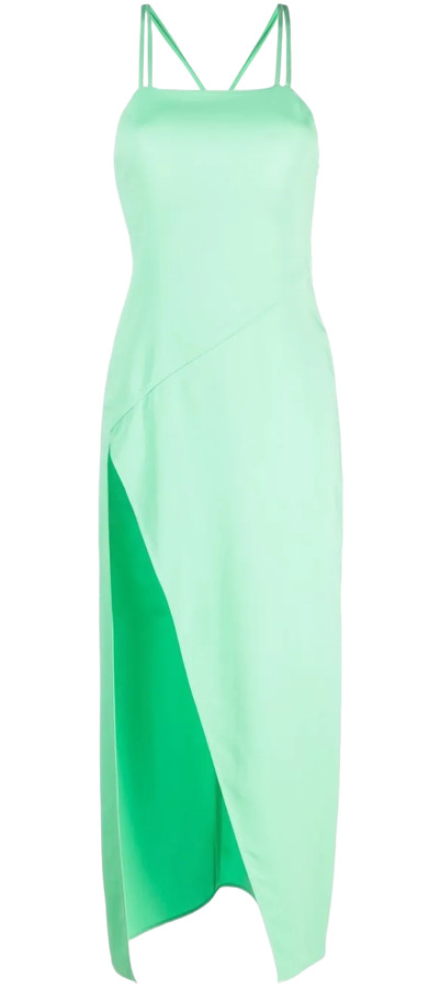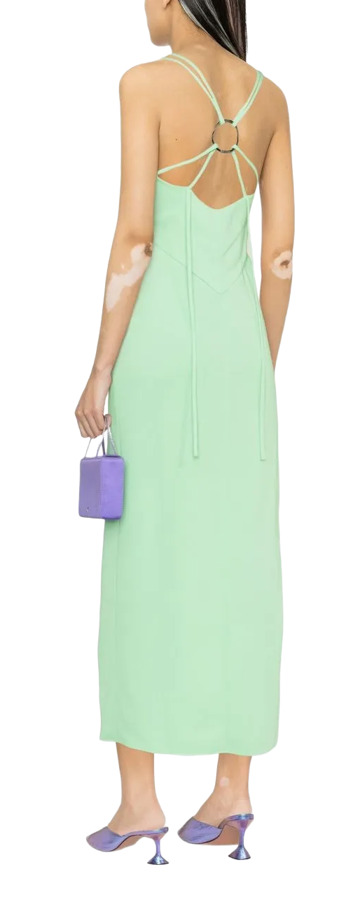 The Attico strappy midi dress in mint green features a square neck and spaghetti straps with stylish rear criss-cross straps. It includes a ring embellishment and a side slit, combining elegance with a modern flair. Perfect for making a statement!