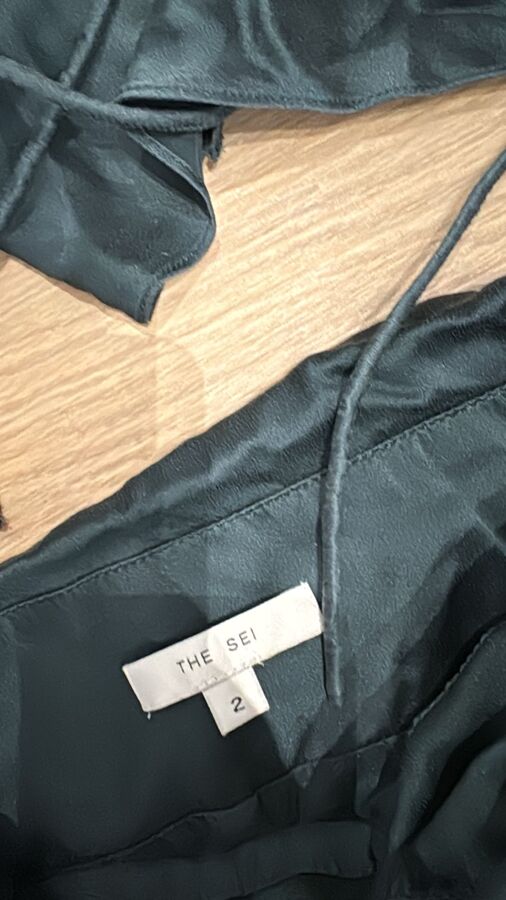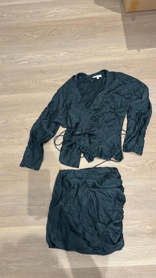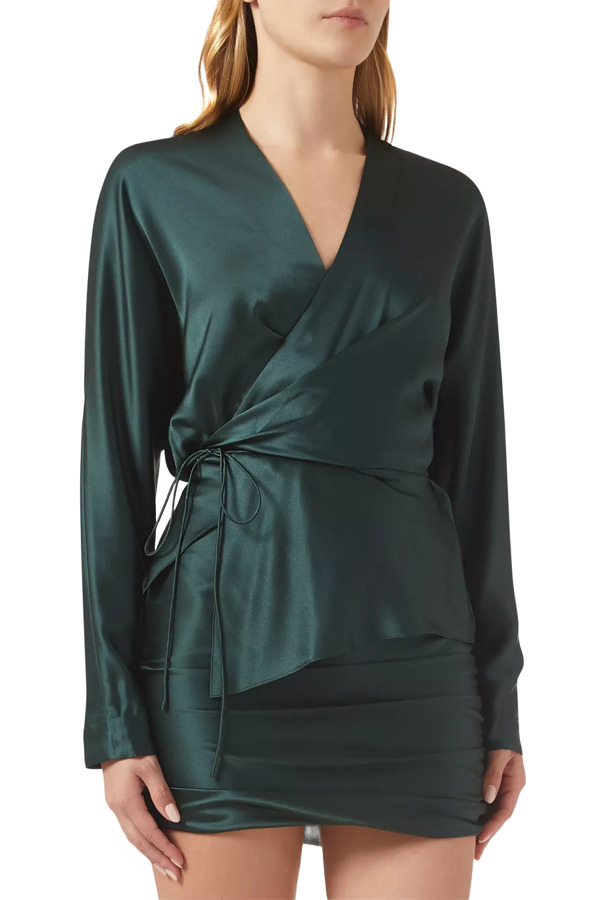 The Sei's chic set combines a minimalist long-sleeved blouse and a coordinating ruched mini skirt, both designed to enhance the feminine silhouette. The blouse, crafted from soft silk, wraps around the body and secures with a tonal tie for a flattering fit. The matching mini skirt features a slim fit with ruched detailing, made from luxurious silk satin and elegantly fastened with a concealed zip closure. This polished ensemble is perfect for any occasion, transforming minimalist silhouettes into instant favorites.