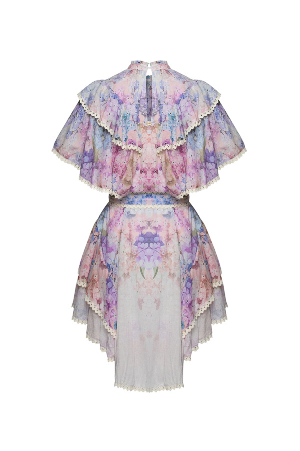 Meet the Farro Mini Dress in Holy Flower Multi by A Story Of — your floral fairytale in motion. Bursting with pastel petals and dreamy lace trims, this layered mini brings romance with a playful twist. Ruffled tiers, flutter sleeves, and a cinched belt make it pure cottagecore magic, no filter needed.