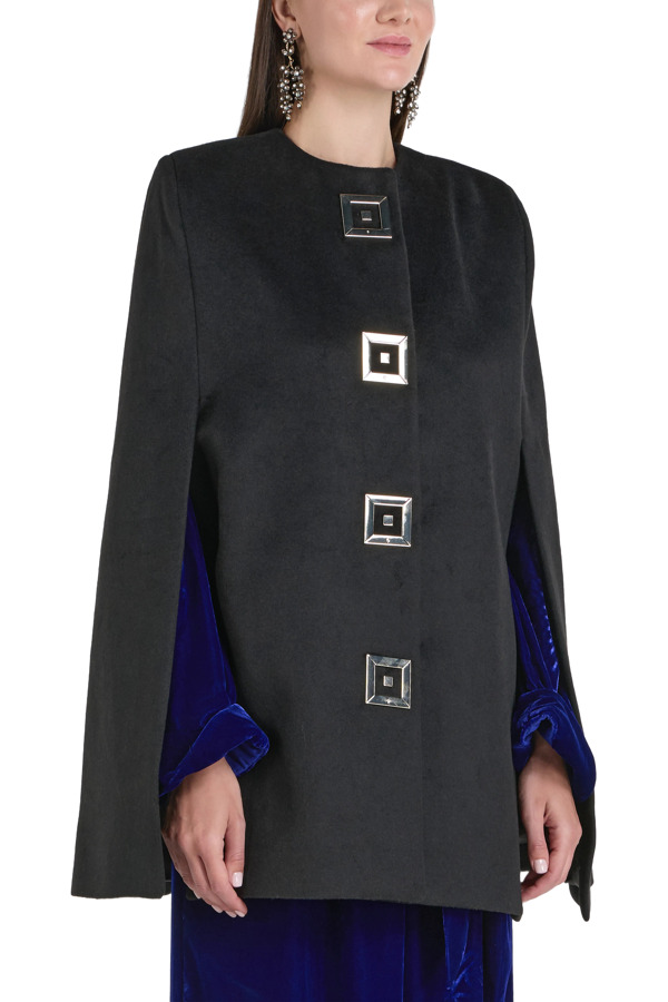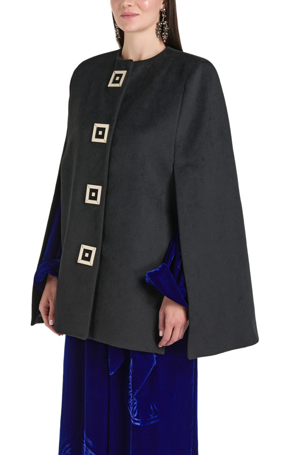 Elevate your wardrobe with The Infinity Gold Silk Velvet Blend Coat with Cape in luxurious black by Themis! This stunning piece combines a flowing cape design with a sumptuous silk velvet blend, creating dramatic and sophisticated layering. Perfect for making a grand entrance, this coat adds an unforgettable touch to any outfit, ensuring you remain the center of attention!