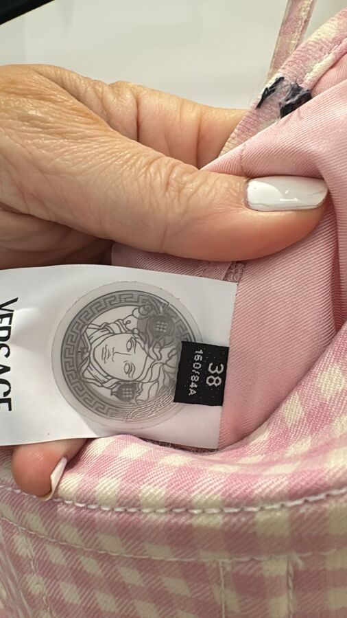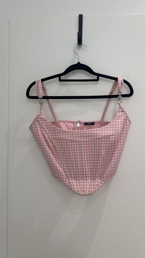 The Versace top features a striking pink corset design crafted from paneled wool with a check pattern. It boasts a scoop neck, adjustable spaghetti straps, and is sleeveless with armscyes. A partially open back and concealed zip closure enhance its elegance, while the corset hem and cropped length ensure a slim fit, making it a chic addition to any outfit.