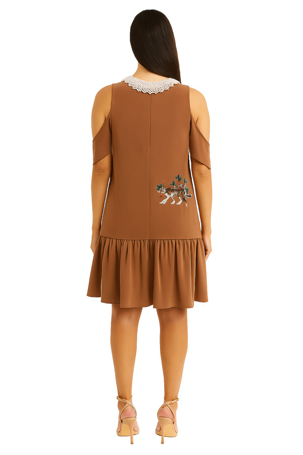 Meet the wild side of chic. this Zayan the Label beauty mixes playful leopard embroidery with a prim pearl collar for the ultimate “good-girl-gone-safari” vibe. Finished with flirty ruffles and a rich chocolate hue, it’s equal parts fierce and feminine — like afternoon tea with a twist of jungle mischief.