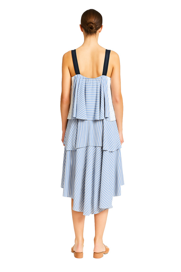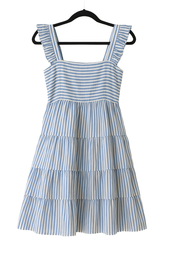 A seaside daydream in dress form. this blue-striped Zayan the Label beauty is all tiered ruffles, peek-a-boo lace panels, and twirl-worthy charm. Equal parts picnic-ready and runway-flirty, it’s your ticket to instant “oh-this-old-thing?” compliments.