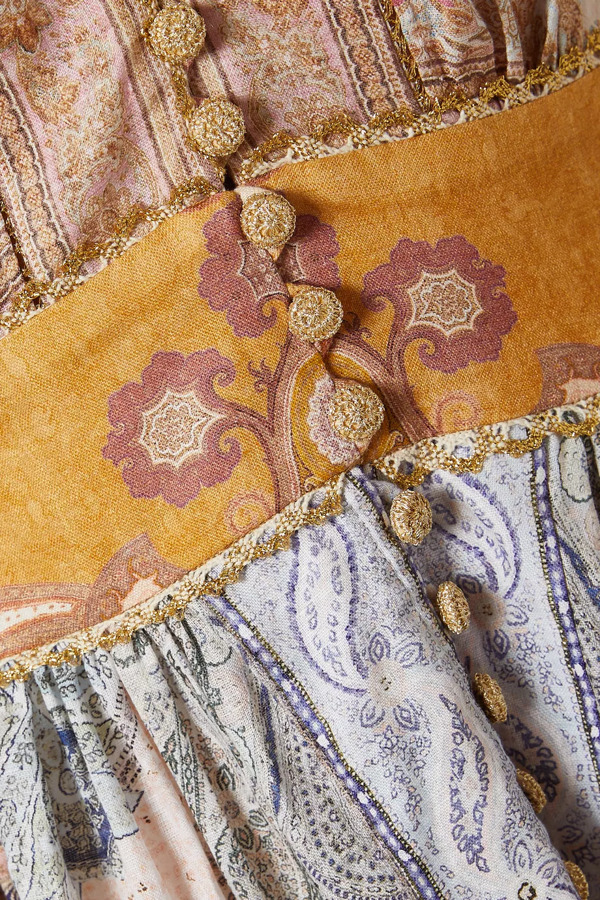 The Zimmermann Anneke Mini Dress features a stunning paisley print crafted from mid-weight linen. This dress is adorned with delicate bead details and lattice trims, complemented by metallic accents for a touch of elegance. The gathered design includes sleeves with elasticated cuffs, enhancing its feminine silhouette. It features a concealed zip fastening at the back for easy wear. Made from non-stretchy fabric, this mini dress is perfect for stylish summer occasions.